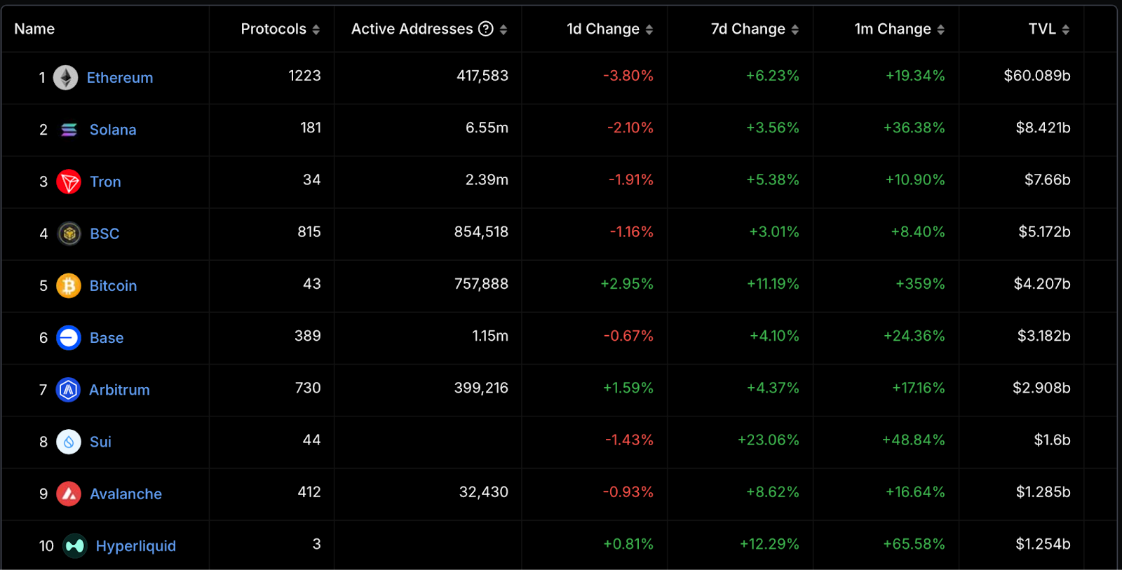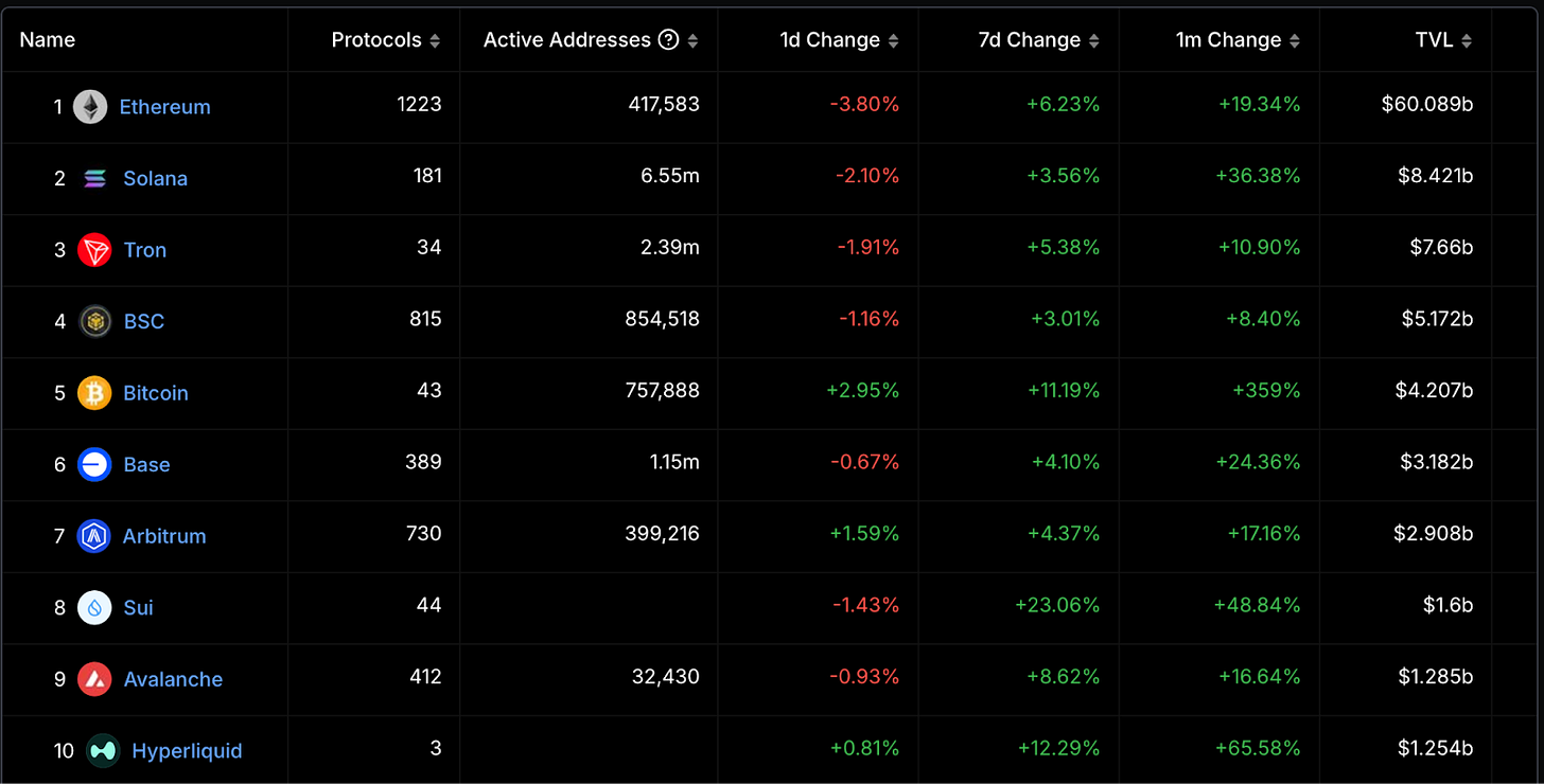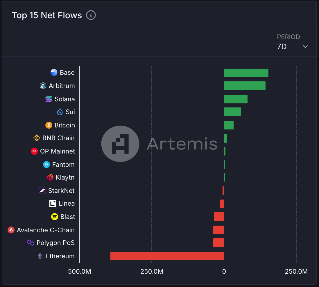 Arbitrum +1.45 億:分析認為這與 Hyperliquid 即將進行 TGE 所引發的資金調動密切相關。由於所有資金在進入 Hyperliquid 前,必須經過 Arbitrum,進一步推動了 Arbitrum 的流量增長。