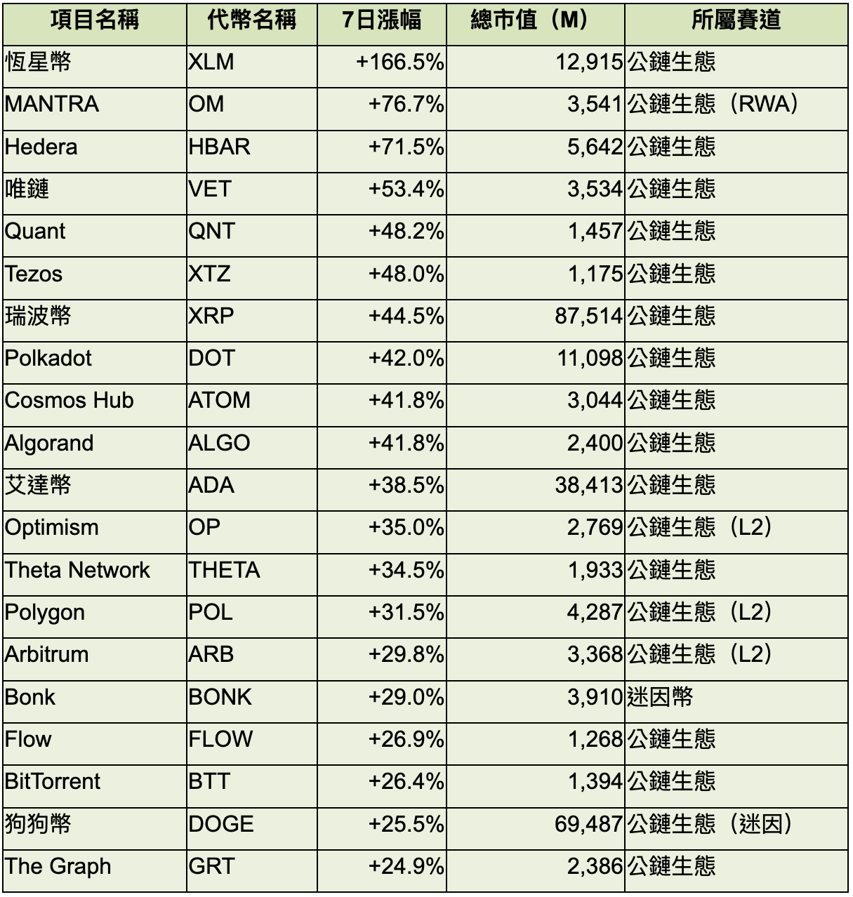 統整前 100 大幣種過去 7 日前 20 名漲幅,幾乎所有上榜幣種都是公鏈生態的代幣,顯示 Alt Chain 賽道已充分發酵,接下來有望輪動到各生態的 DeFi 代幣、迷因幣等應用代幣。