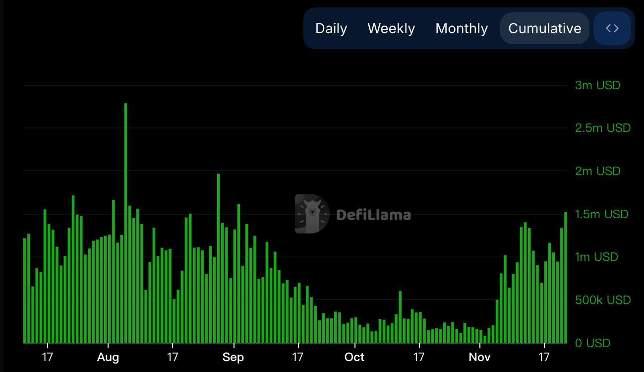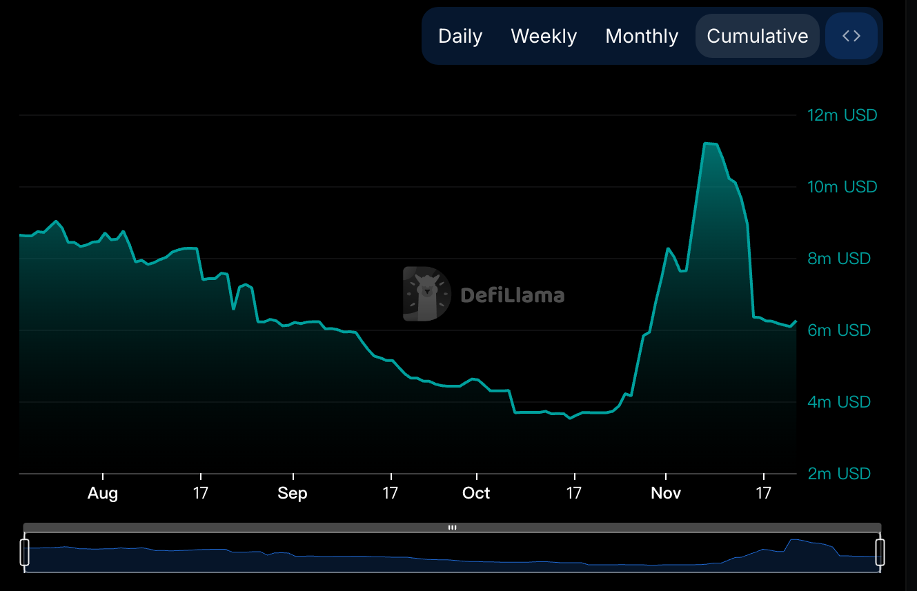 穩定幣市值 625 萬美金,所有公鏈排行第 57 名。從走勢來看,10 月底消息發出後穩定幣市值飆上 1,100 萬美金,進到約第 45 名,但目前已大量回撤。數字及排名均顯示生態中並沒有過量流動性湧入。
