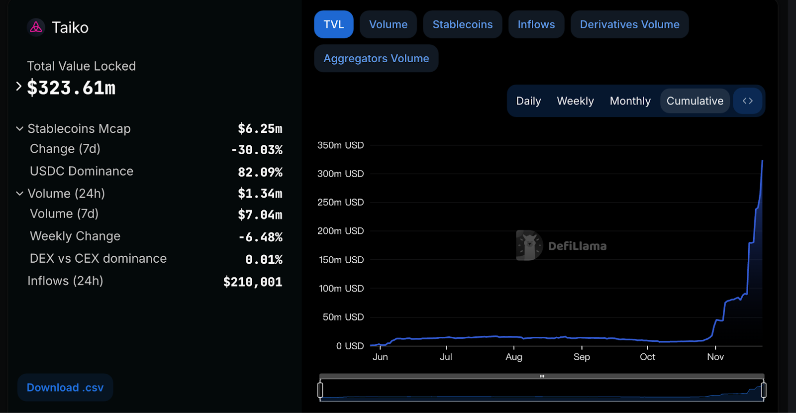 然而交易者必須區分這項政策是否能夠幫助 Taiko 憑藉 BTCFi 敘事彎道超車其他 Layer 2?還是僅是單純衝高 TVL 的補貼手段,接下來將以 Taiko 生態數據進行分析: