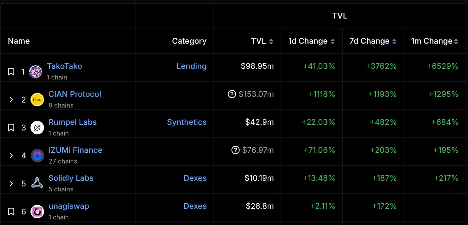 漲幅最大項目(TVL 大於 1,000 萬美金)