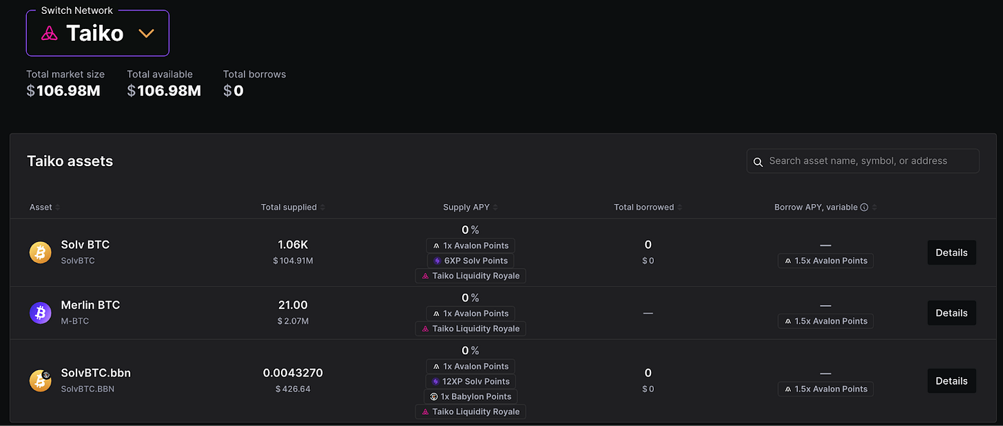 活躍於 BTC Layer 2 生態、BNB Chain、以太坊主網的借貸協議 Avalon 也在近期進駐 Taiko 並成為 TVL 龍頭,宣布將把 Avalon 旗下由 BTC 賦予價值的 $USDa、$sUSDa 及 CeDeFi 業務引入 Taiko,然而目前項目中僅有借貸服務,借出資金為 0,質押者以槓桿刷積分為主要目的。