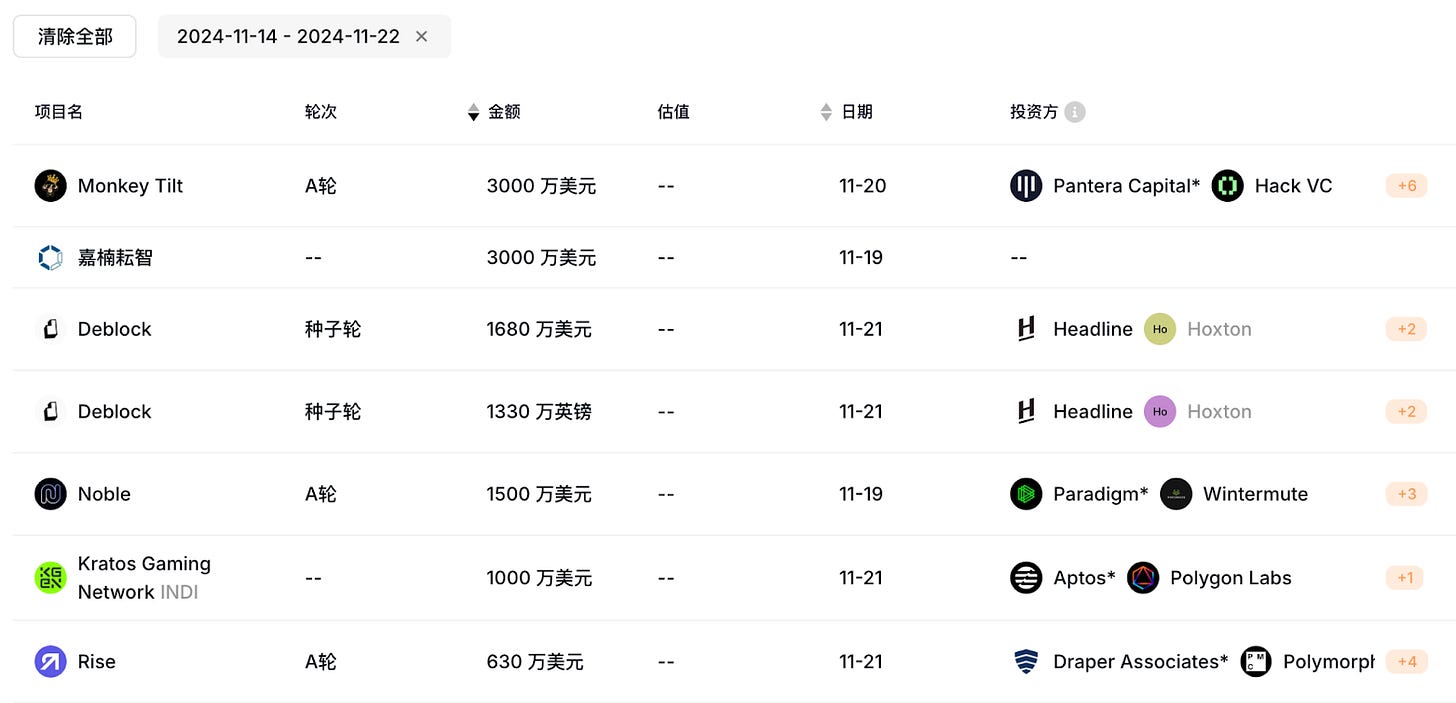Monkey Tilt(3,000 萬美元)是結合體育賽事的 GambleFi 平台,此輪融資案由 Pantera Capital 領投,參投包括 Polychain、Hack VC 等,總融資額達 5,100 萬美金超過 Polymarket,具有高度潛力。