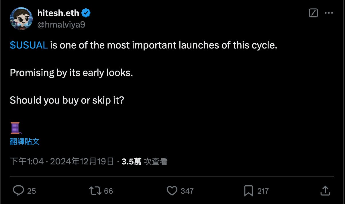 內容精選 - TGE 漲幅超過 2 倍的 $USUAL,該買進還是埋頭找下個標的?