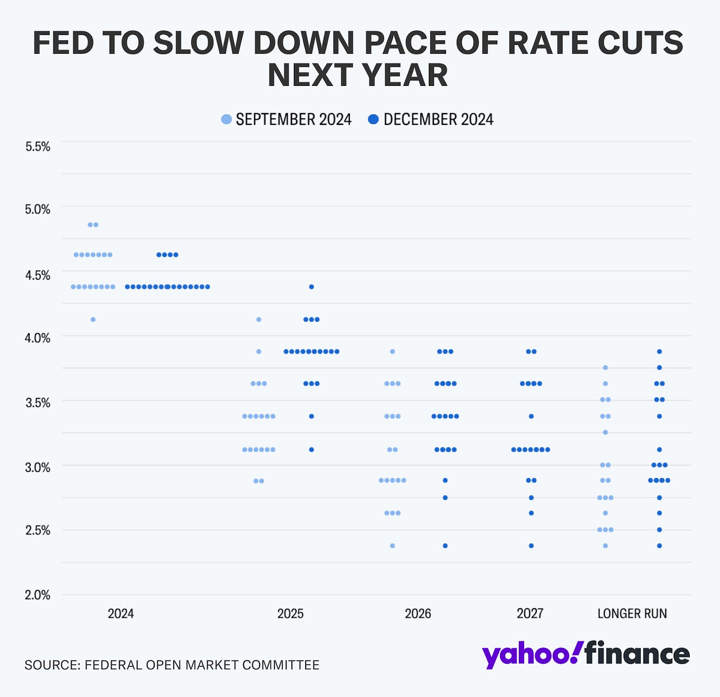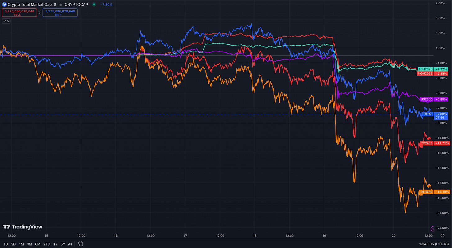 對照今年 9 月和 12 月的利率點陣圖,可以發現聯準會委員中已經大幅減少降息幅度,原本預計在 2025 年降息 4-5 碼,此次減少至 2 碼。降息趨緩帶來的利空,導致美股和加密市場大幅下跌,更受資金行情和市場流動性影響的山寨市場下跌幅度為美股的 3 倍。