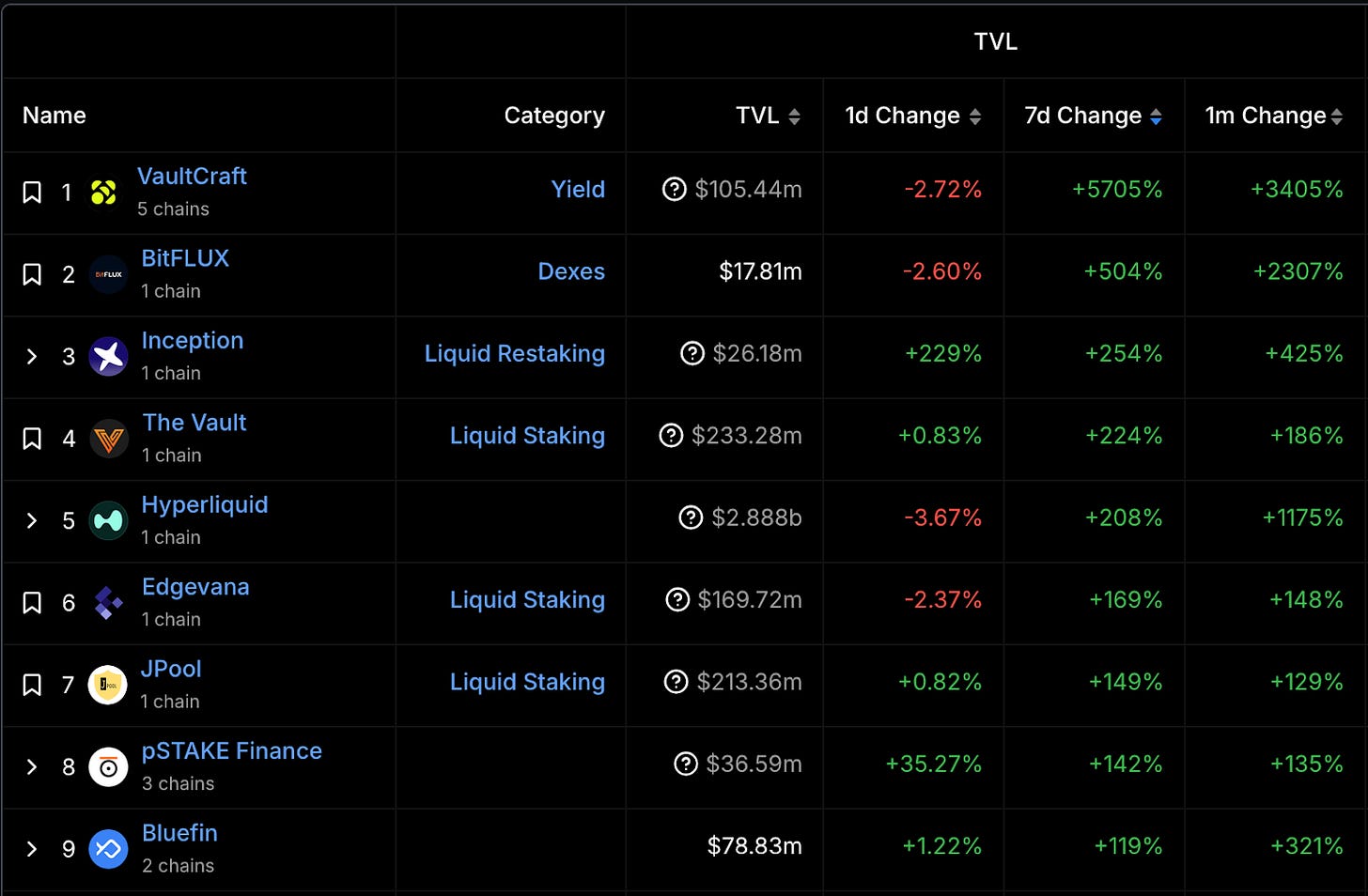 漲幅最大項目(TVL 大於 1,000 萬美金)