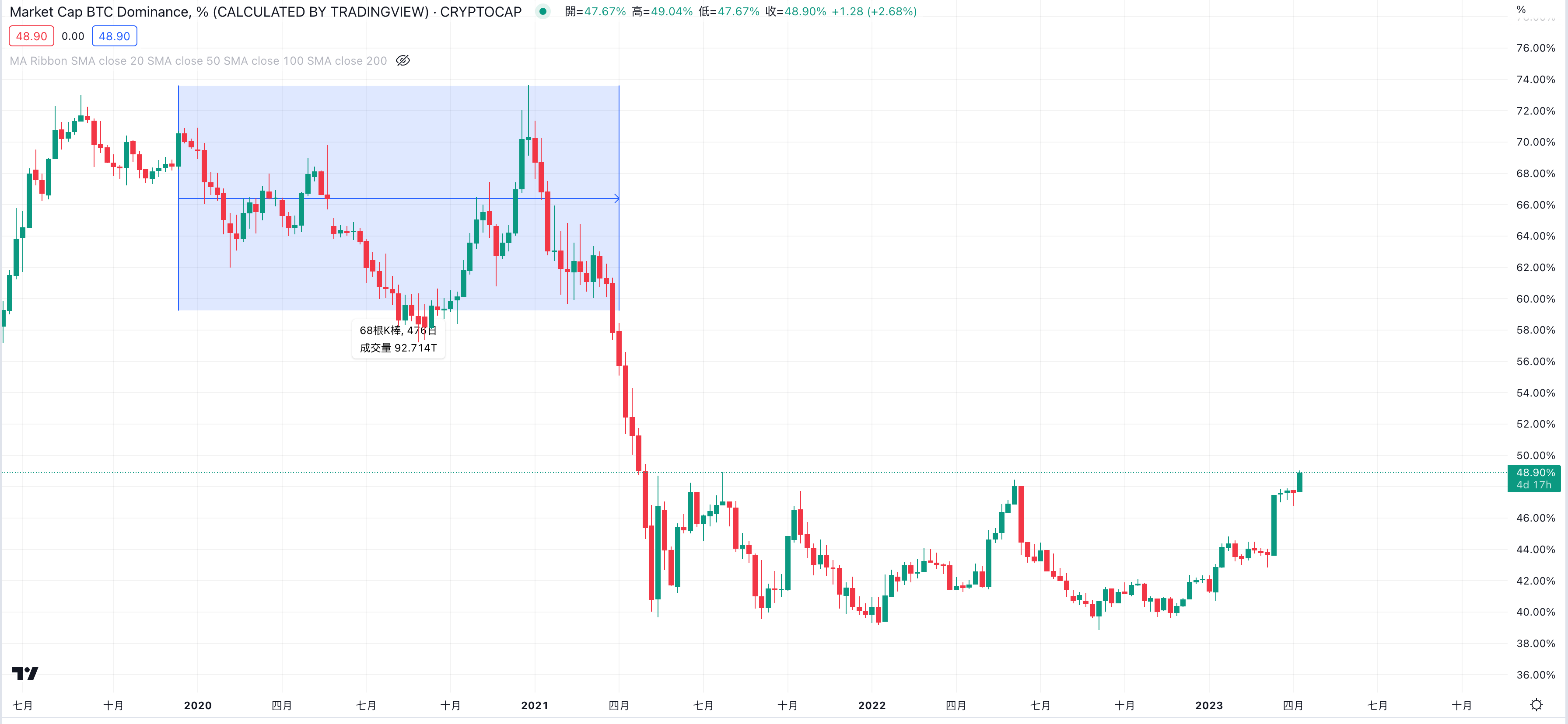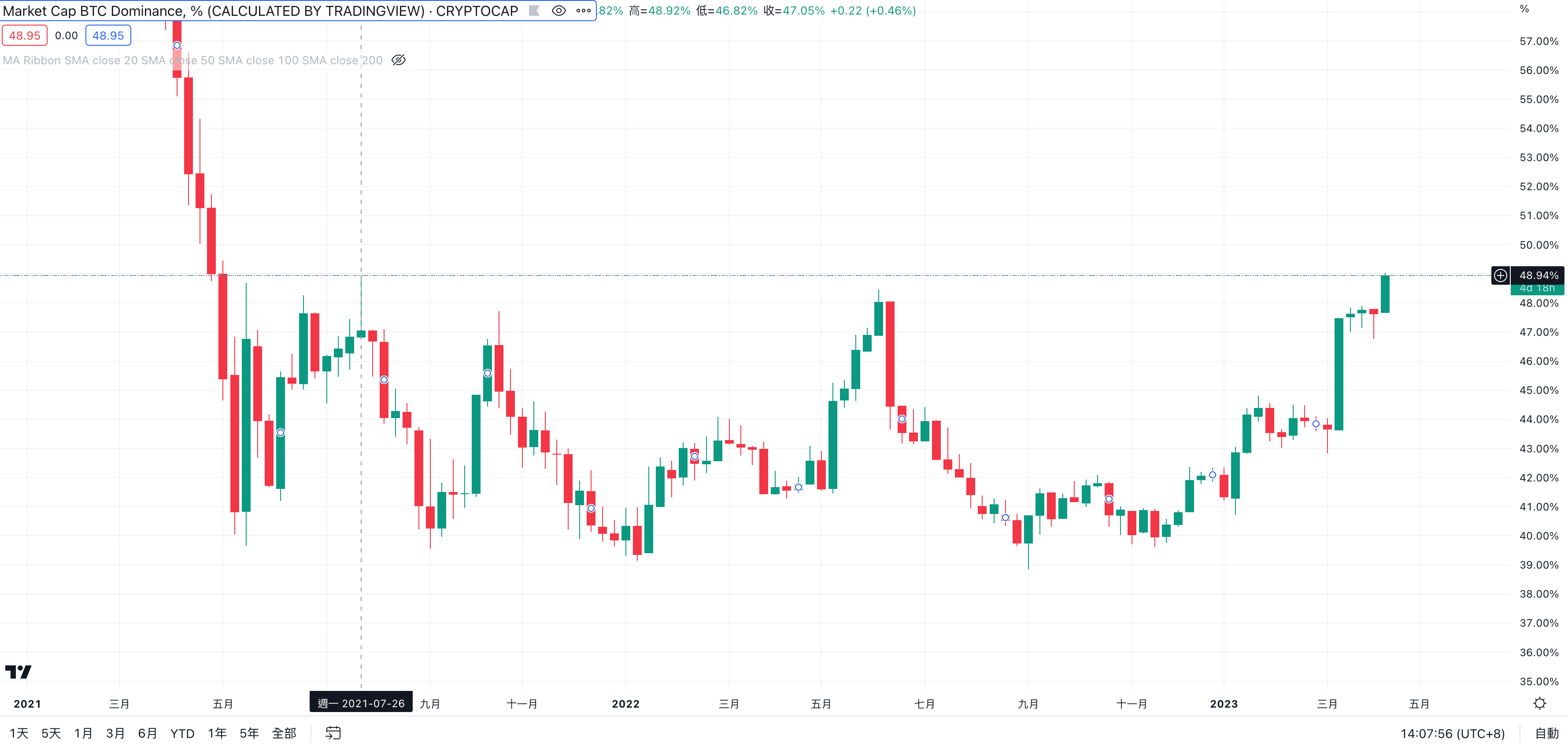 同時BTC.D(比特幣市占率) 也突破了2021年7月以及2022年6月的前高,目前為48.9%