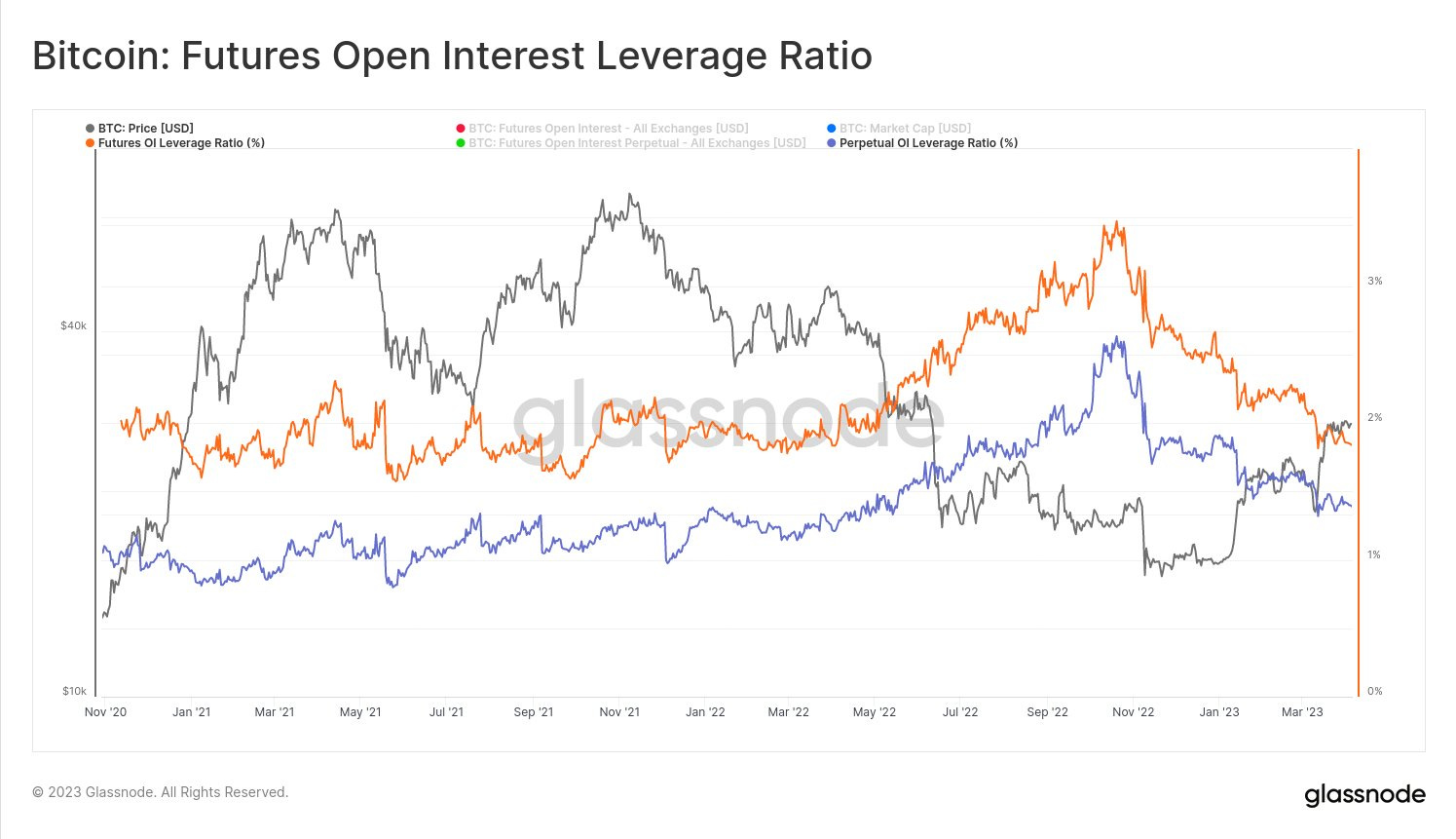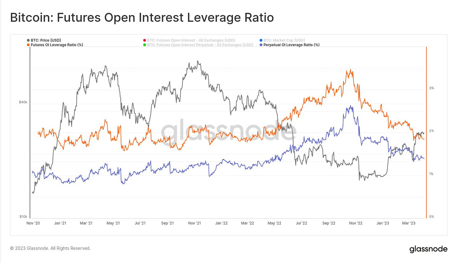 下圖為比特幣期貨未平倉槓桿比率與價格變化圖,可以看到無論是期貨還是永續合約,槓桿率都往下降,而幣價往上走,說明了價格的上升並非槓桿所導致。