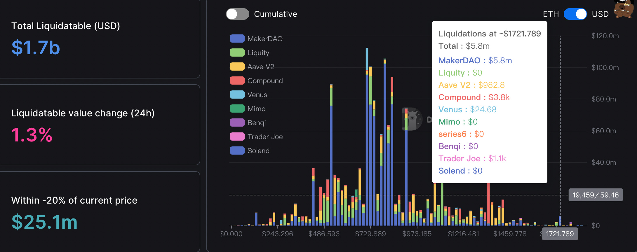 近期以太坊清算價格 & 規模:清算點 位1721,580萬美元規模