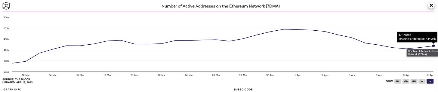 以太坊每日活躍地址數:43.4萬,較上週下滑,本週重點是比特幣