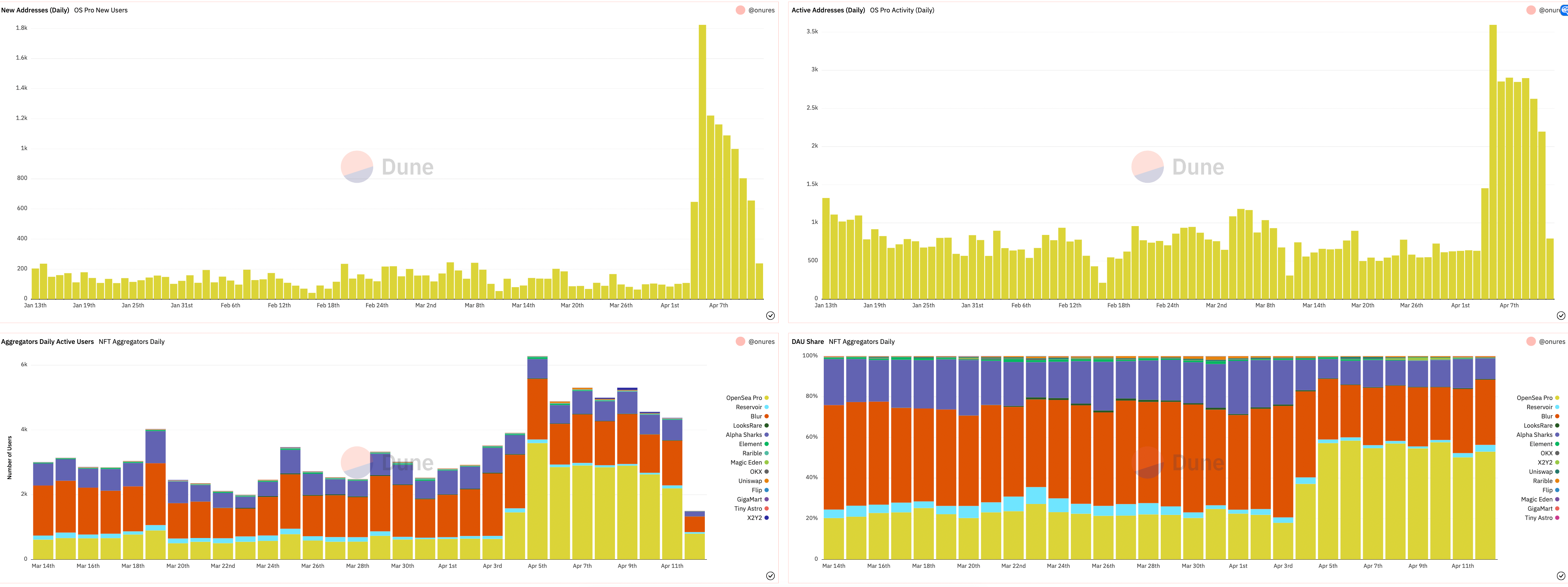 也因為有著如此顯著的進步,目前 OpenSea Pro 的聚合交易份額與 Blur 相當(甚至超越),近日大幅增長,日活躍地址超過 2800,日交易量超過 250 萬美元,是以前的 3-4 倍。