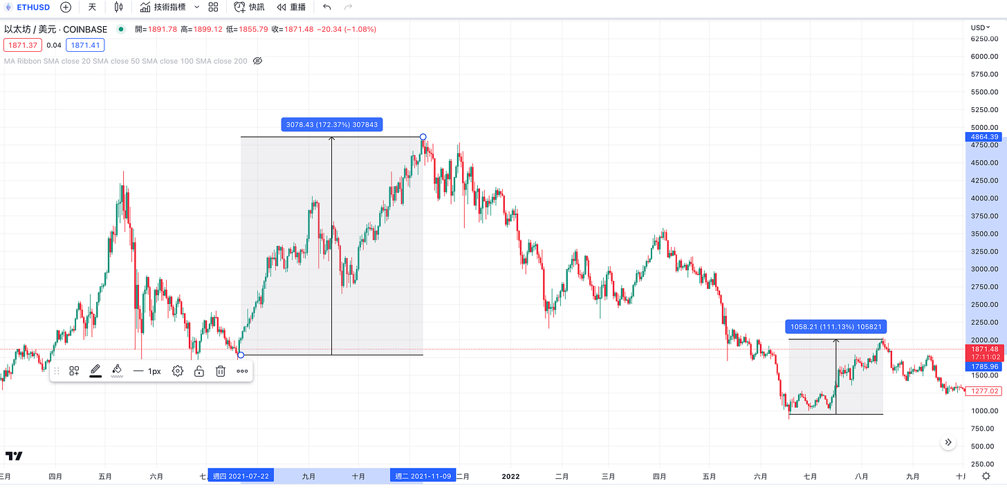 前文有提到 BTC.D 前高發生在2021年的7月以及2022年的6月,BTC.D 見頂後, ETH 隨即在四個月內暴漲了170%(2021/7)以及兩個月內上漲超過110%(2022/6)