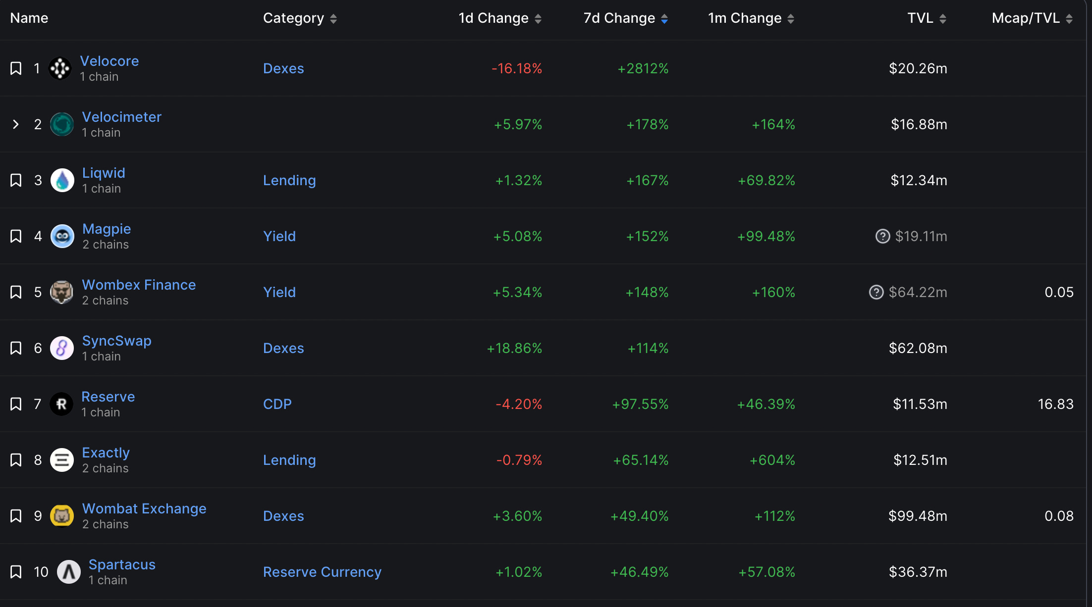 ve 協議正夯:其中 Wombat 生態系(可以視為是 BSC 上的 Curve,目前也已在Arbitrum上部署)就有三名在榜上,另外前兩名也都是 Velodrome(建立在 Optimsim 上的 ve(3,3)協議)的fork,第一名建立在 zkSync Era ,第二名則是在 Canto