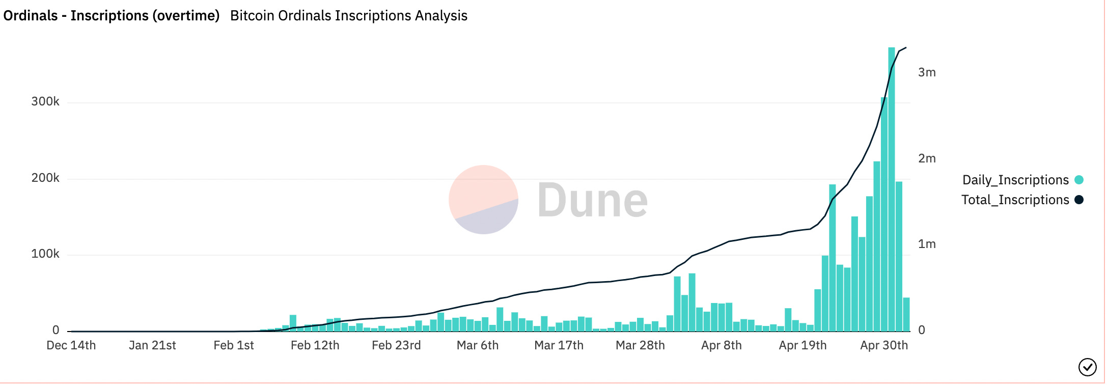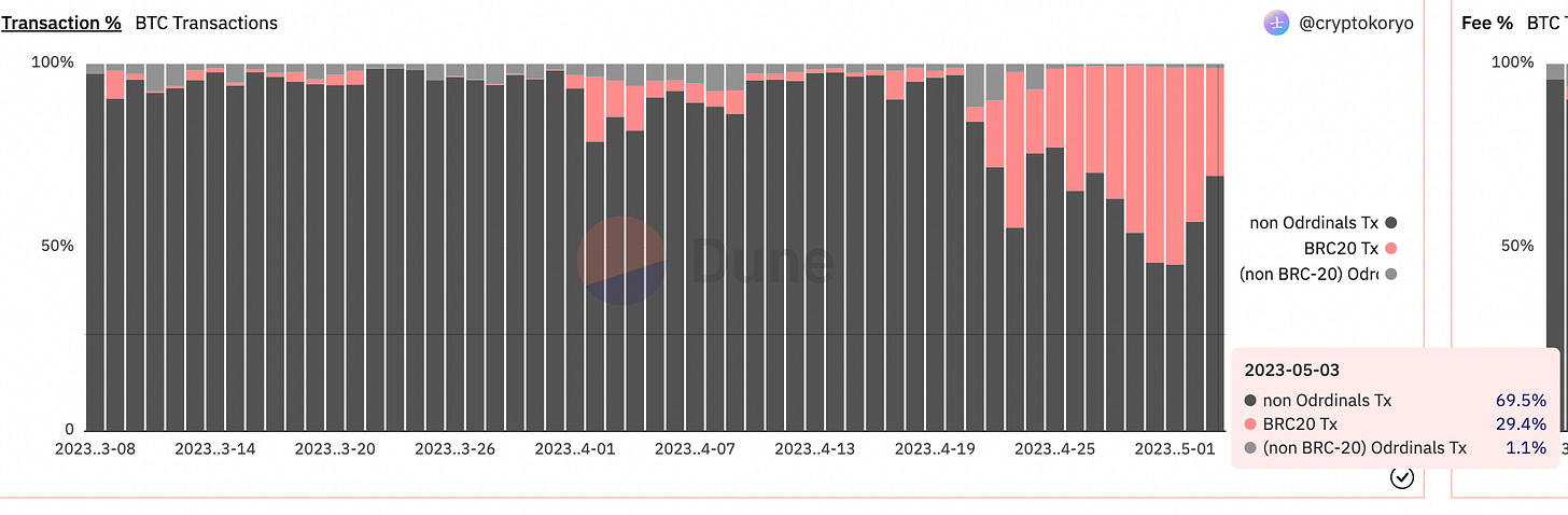 若觀察整體比特幣交易活動,更是可以發現使用 Brc-20 標準銘刻的交易筆數爆量上升,從4月20開始便佔了總交易筆數的18%,最高更是佔了總交易筆數的53%,達到一半以上!