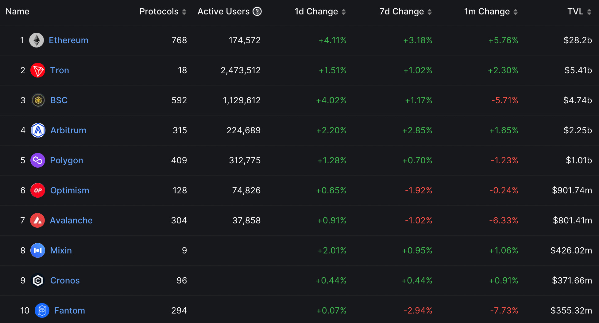 前10大公鏈/ Layer 2 總鎖倉量變化: