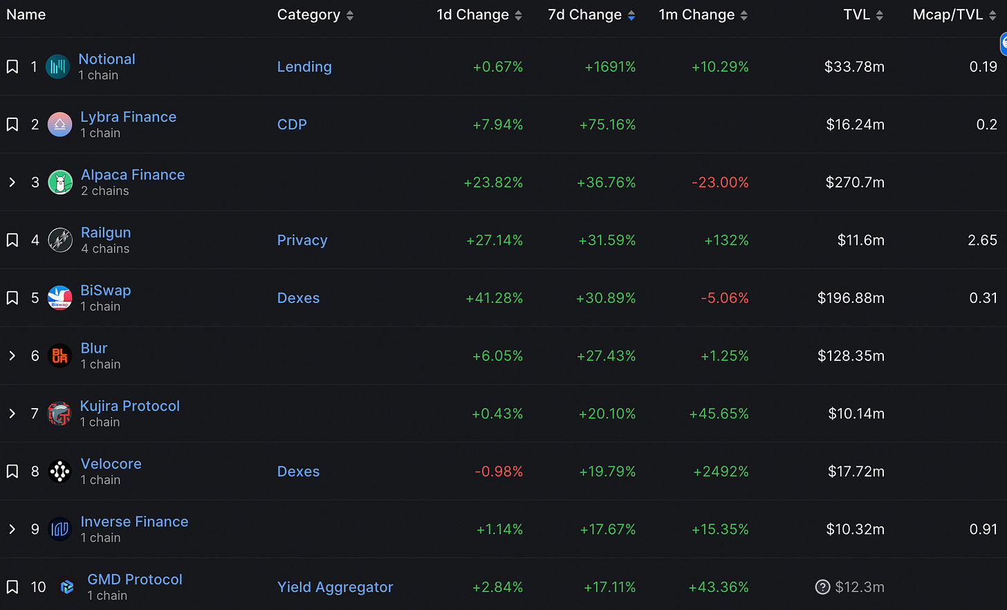 這週 TVL 成長最高之協議(最低1000萬美金TVL)前10名賽道不一,包含了 借貸、穩定幣、槓桿農場、Dex等。