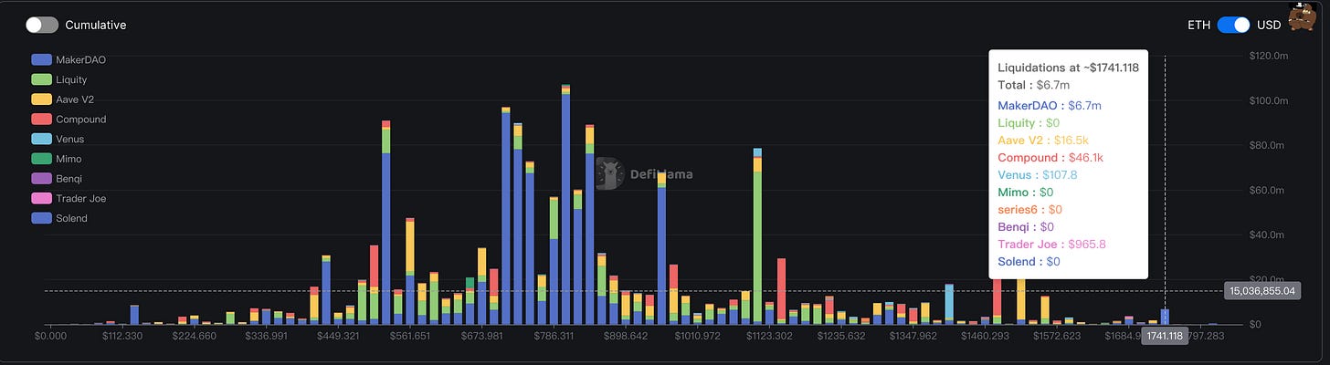 近期以太坊清算價格 & 規模:最近的清算點位為1741,規模為670萬美元,價格與規模都與上週相同。