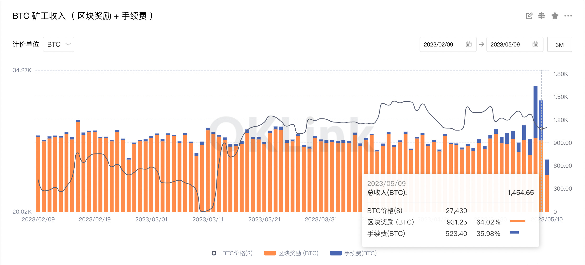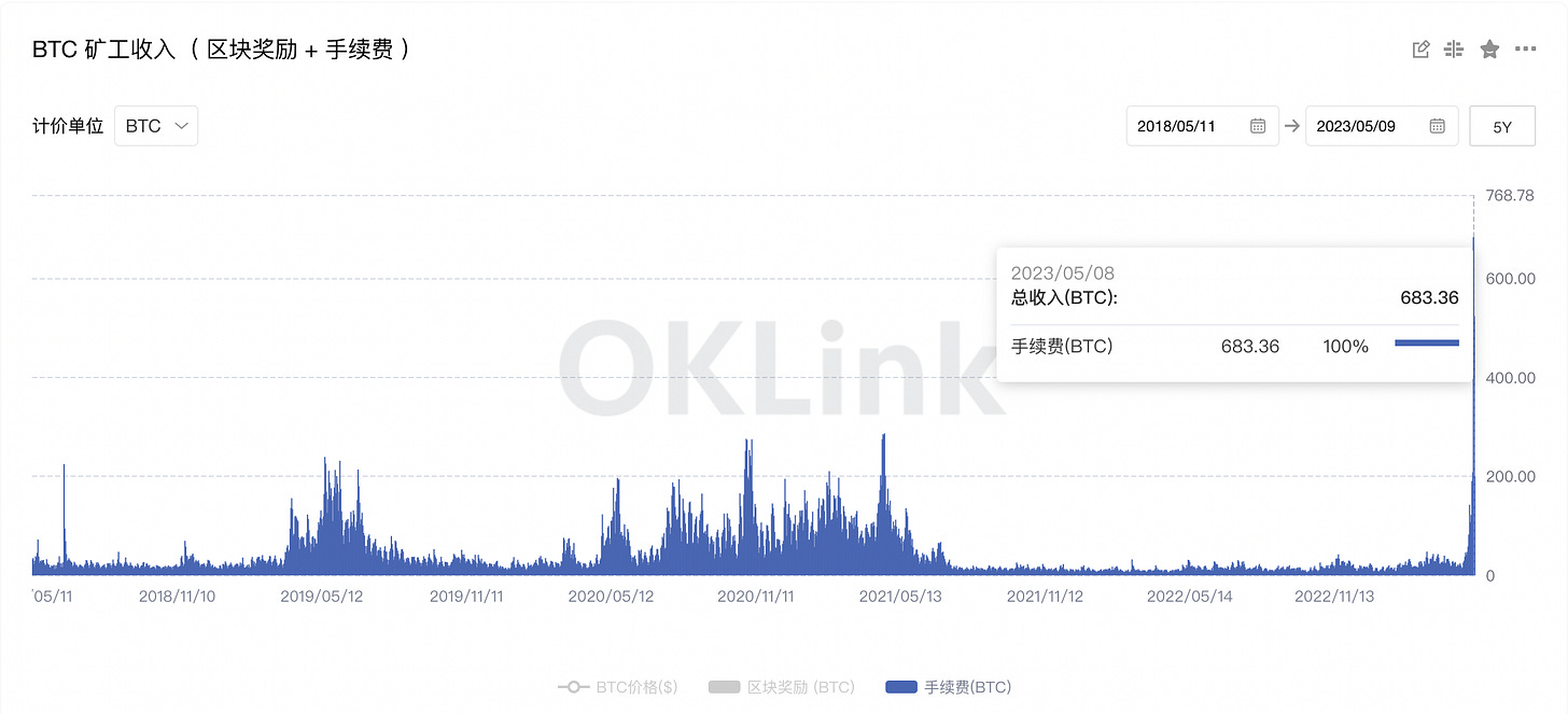 如上文所述,礦工收益由區塊獎勵與交易手續費所組成,因 Brc-20 造成的熱潮,使得交易活動激增,手續費也隨之暴漲。