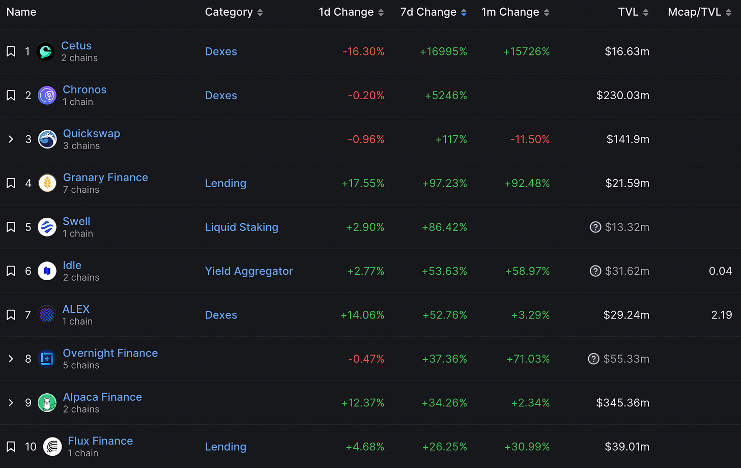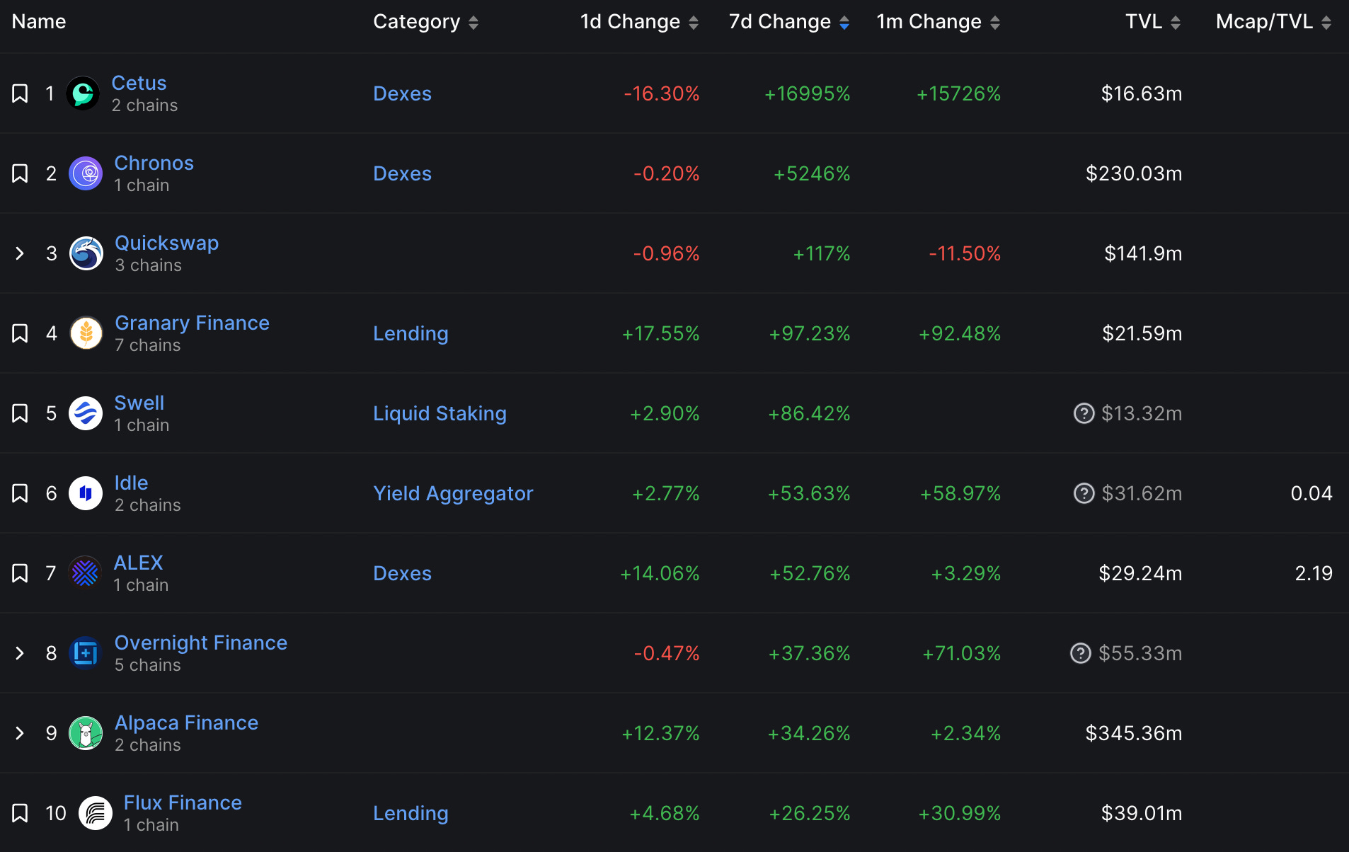 這週 TVL 成長最高之協議(最低1000萬美金TVL)前10名賽道不一,較為明顯的是 Cetus、Chronos、Swell 都是近期幣圈媒體常客。