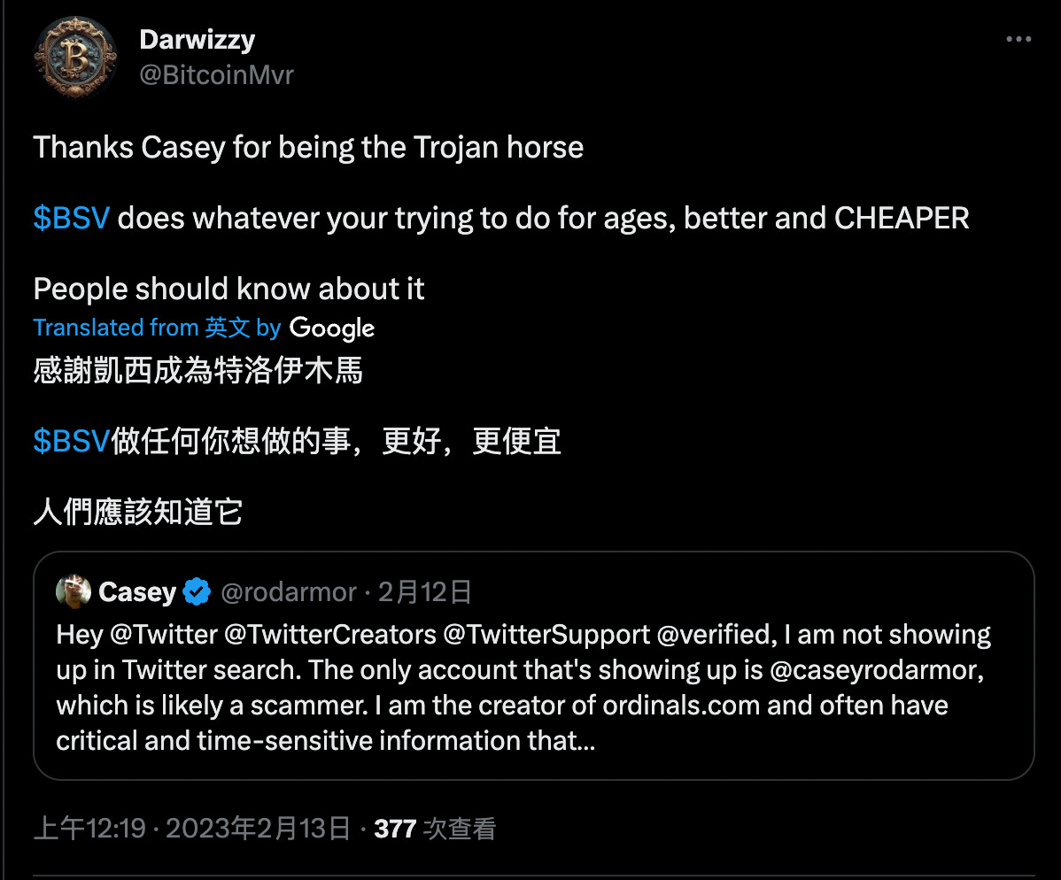Brc-20 的發展方向與 BSV 高度重合,這也讓 BSV 支持者樂不可言,更發推表示 Ordinals 的創始者為「特洛伊木馬」