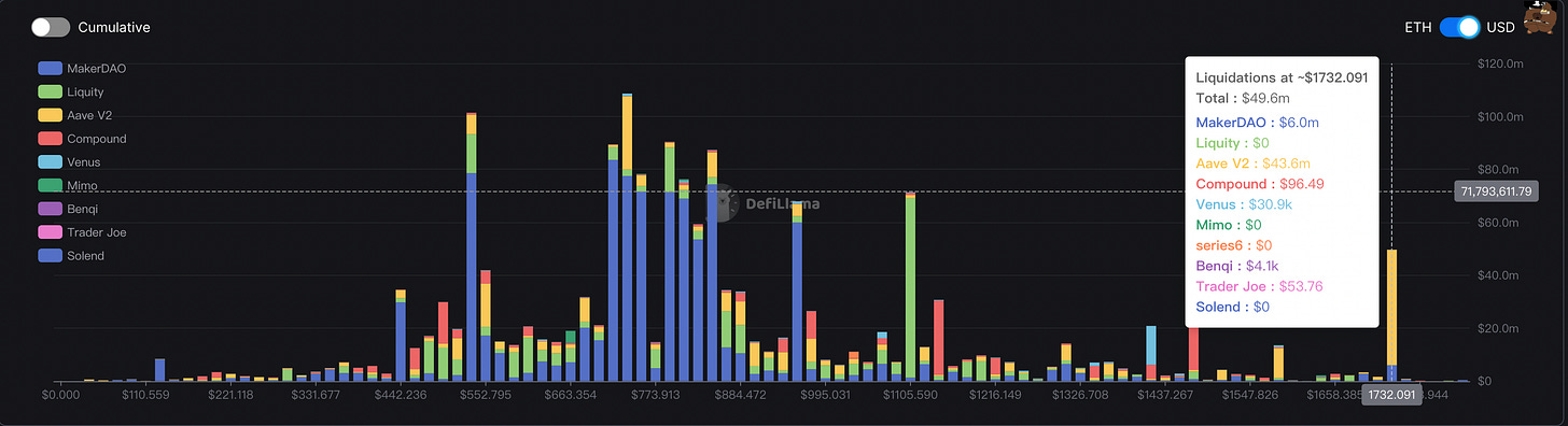 近期以太坊清算價格 & 規模:最近的清算點位為1732,規模為5000萬美元,價格與上週相差不遠,但是規模卻是8倍之多。