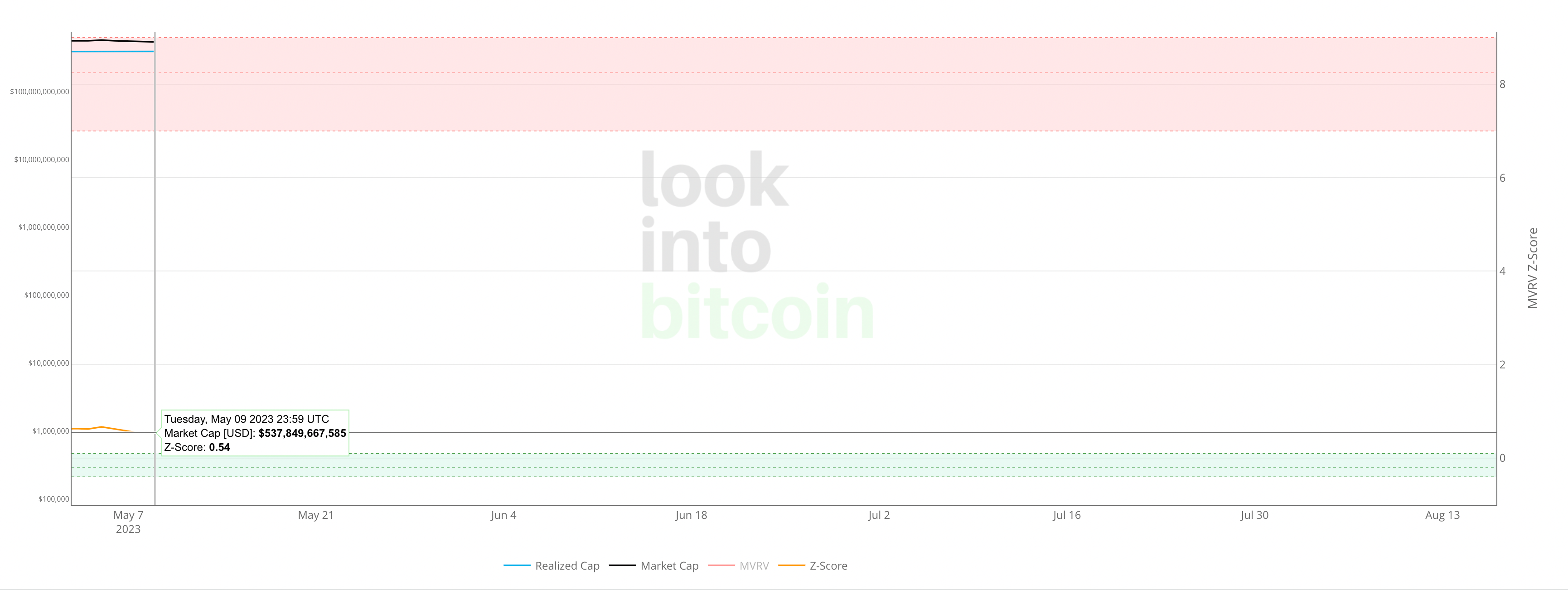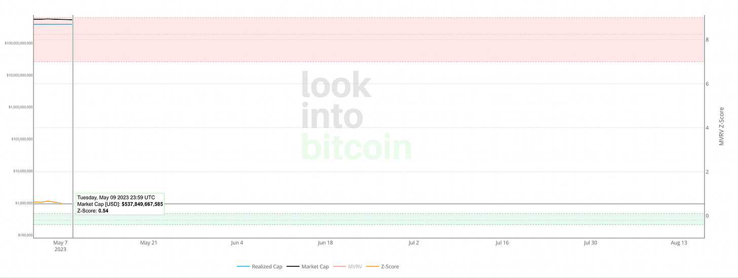 比特幣 MVRV-Z 指標:0.54,微幅下降(上週0.61,小於1買入)