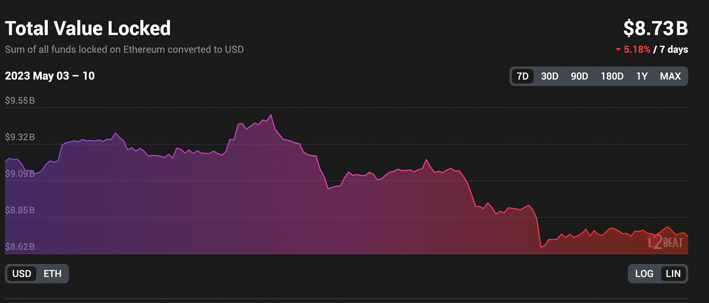 本週整體 DeFi 總鎖倉量變化:-2%,整體市場波動極低,市場焦點不在 DeFi 上