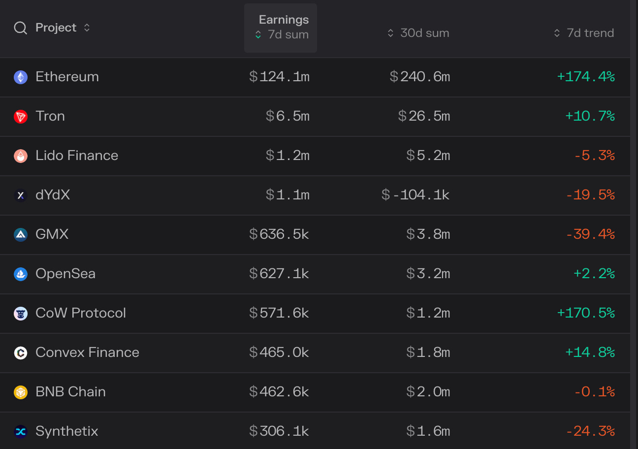 與自身相比不止佔比提高創下新高,對比整體加密貨幣市場,手續費收入更是僅次於以太坊。
