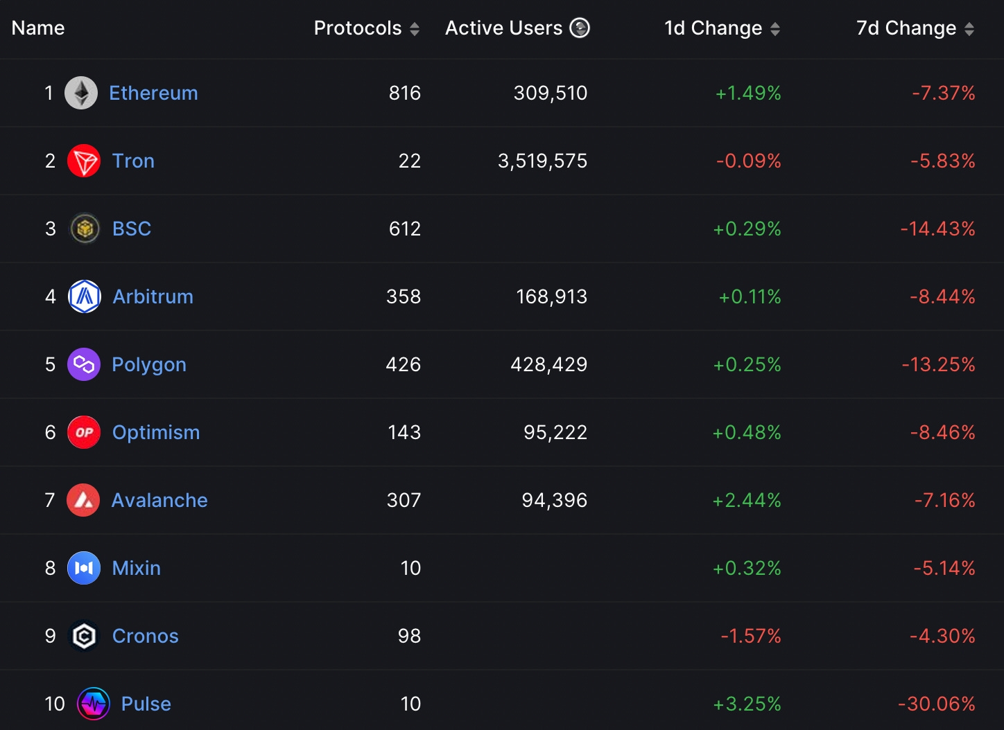 以七天來看皆為下跌趨勢,可以留意到 BNB(跌14.43%)、Polygon(跌13.25%) 因 SEC 訴訟案影響,造成鎖倉量嚴重下滑。