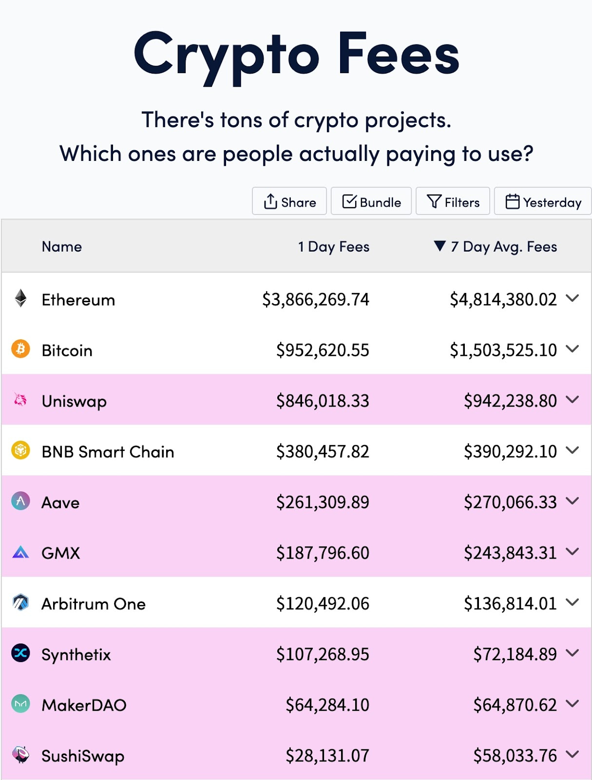前10名均為老牌藍籌協議,以太坊生態系佔大多數,其中 BNB Smart Chain 雖處在第四名的位置,但與上週相比減少了24%的收益(上週賺取費用約為51萬美元)