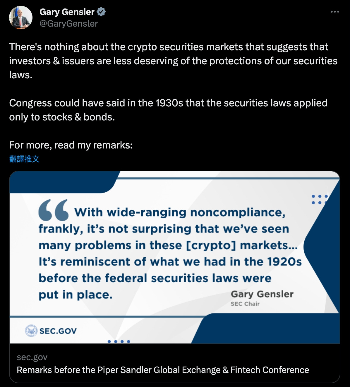 SEC 主席 Gary Gensler 在6月12日發推表示: