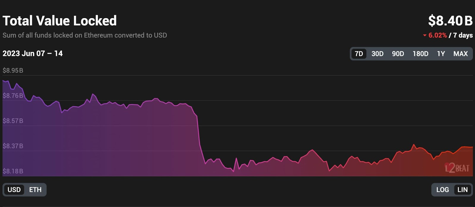 本週下跌6.02%,主要原因可以歸咎於以太幣的幣價下跌。從美元計價的鎖倉量來看是呈現斷崖式的圖表,但切換為以太幣計價則會發現,這禮拜是越來越多的以太幣往 Layer 2 聚集。