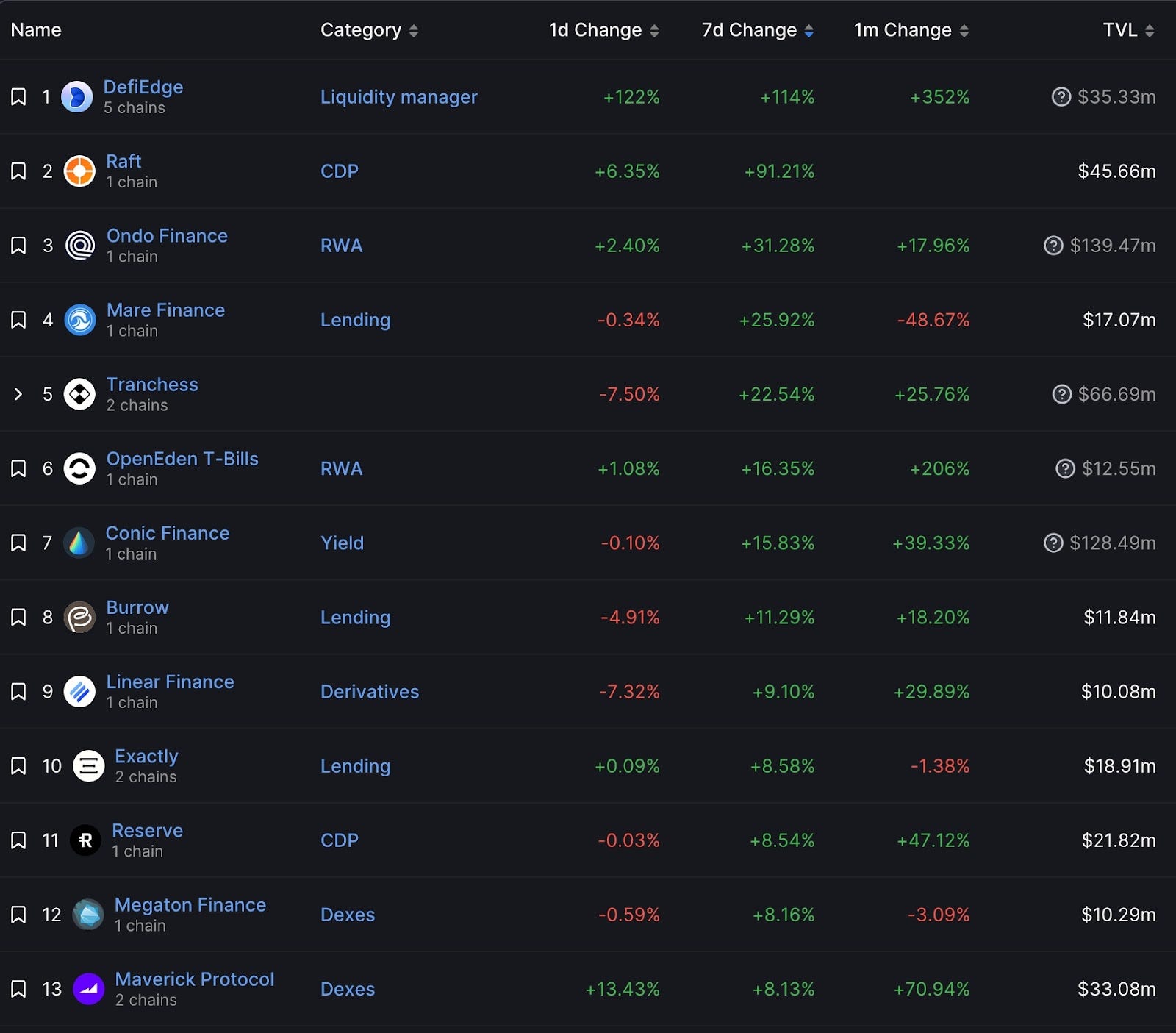 而上文提到的幣安新一期 Launchpool 項目 Maverick Protocol,在本週也有70%的鎖倉量成長,表現亮眼,排名第13名。