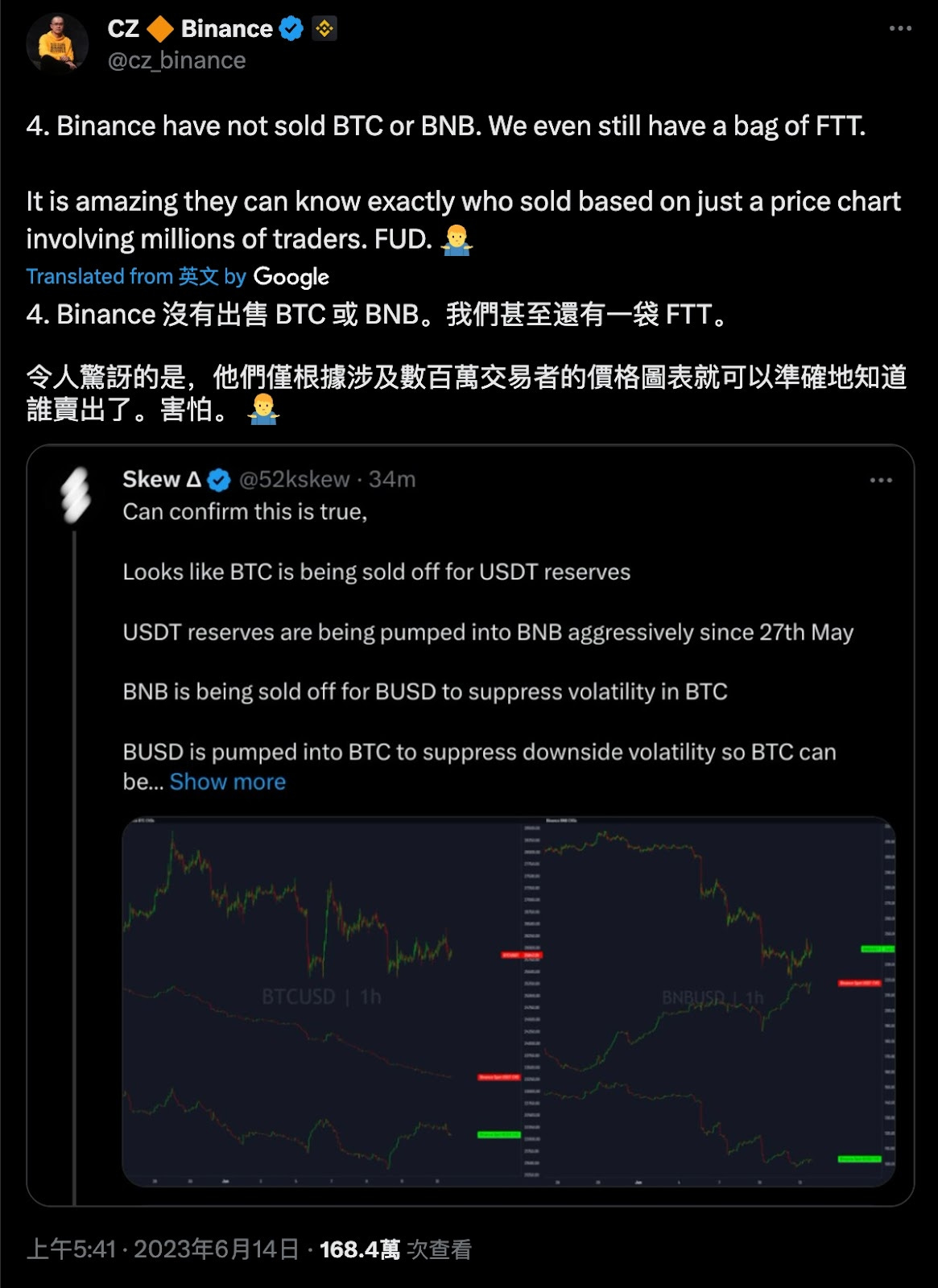 面對此控訴, CZ 回應:幣安並沒有出售 BTC 或是 BNB,甚至我們還有一堆 FTT 呢。這些人光看K線,而這些K線涉及數百萬位的交易者,以此就可以知道是誰在賣幣,真是太令人驚訝了。純屬 FUD