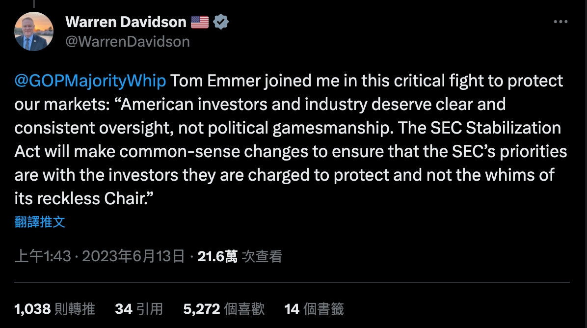 而在6月13日,美國眾議院議員 Warren Davidson 在推特中宣布,他已經正式提出《美國證券交易委員會穩定法案》,要求重組美國 SEC 並解僱主席 Gary Gensler。這項法案得到了另一位眾議院議員 Tom Emmer 的支持。