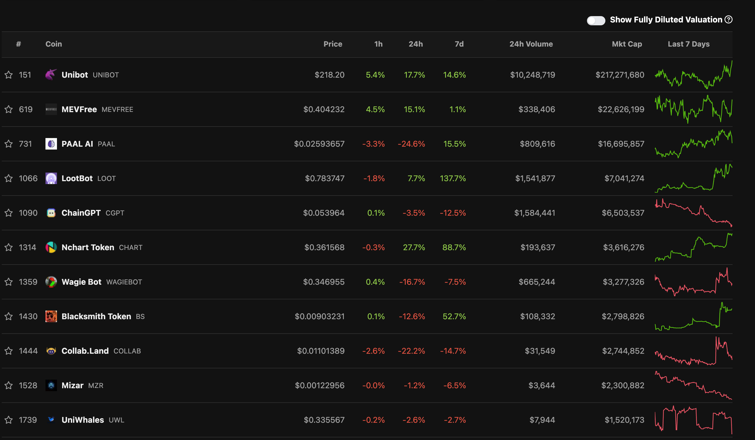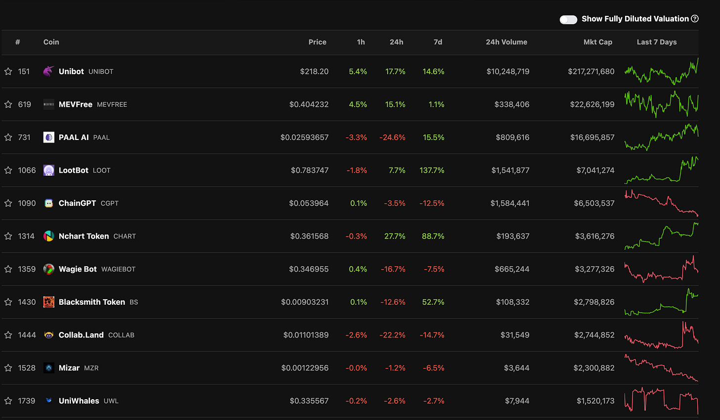 而我們也可以在 CoinGecko 中看到,多數 Telegram 機器人代幣在近七天幣價都有相當不錯的表現,其中 Unibot 更是創下歷史新高,似乎與疲弱的大盤是兩個世界。