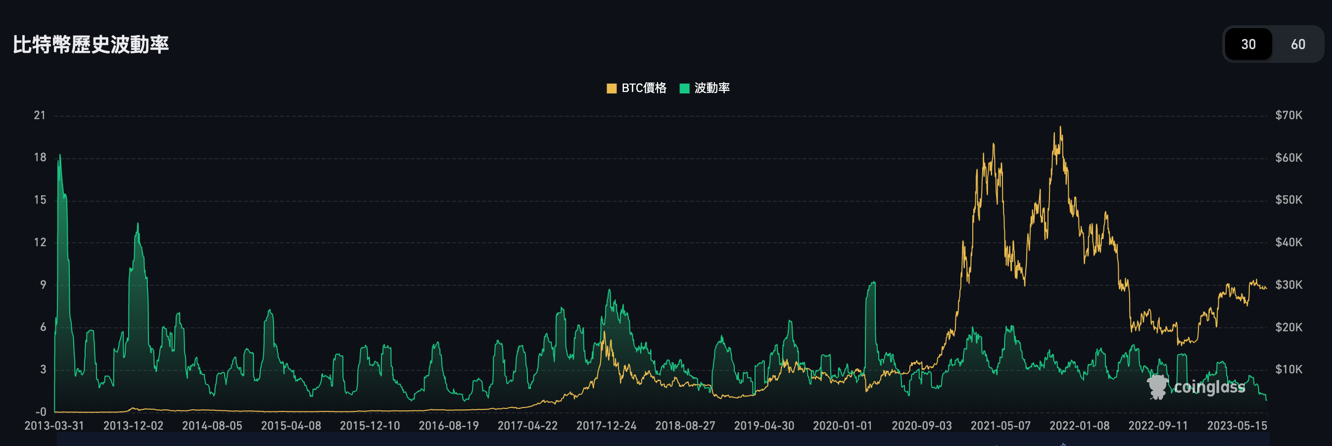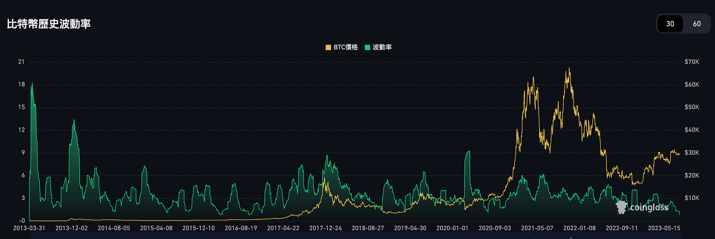 數個月以來比特幣價格仍在 29000~30000 間震盪,且波動極低,根據 Coinglass 的數據來到了 0.67% 的歷史新低。