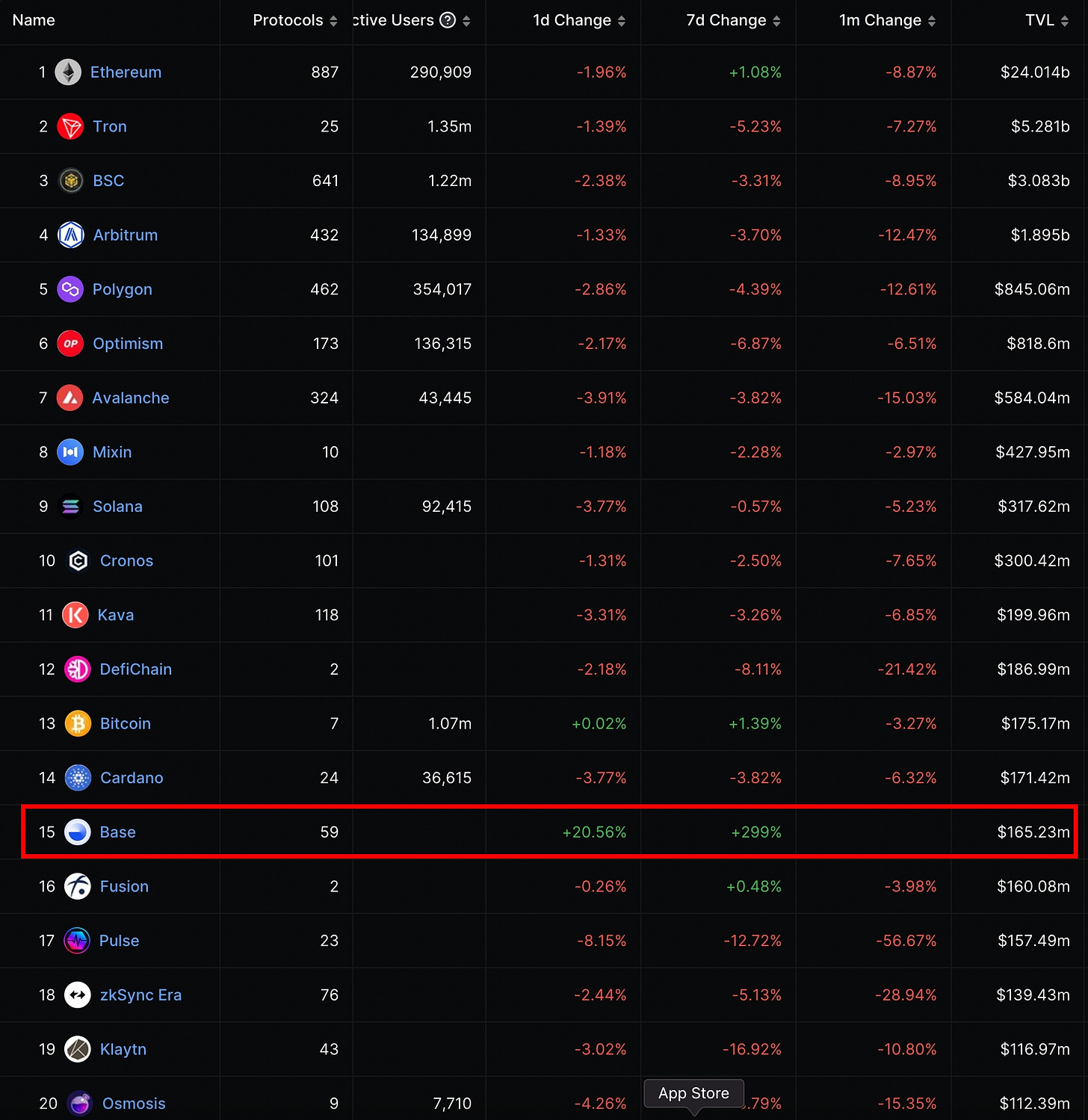 打開 DeFiLlama 查看各公鏈近七日 TVL 增長情形,在一片下跌之間,Base 居然逆勢成長將近 300%,也代表著其他公鏈的資金紛紛往 Base 移動