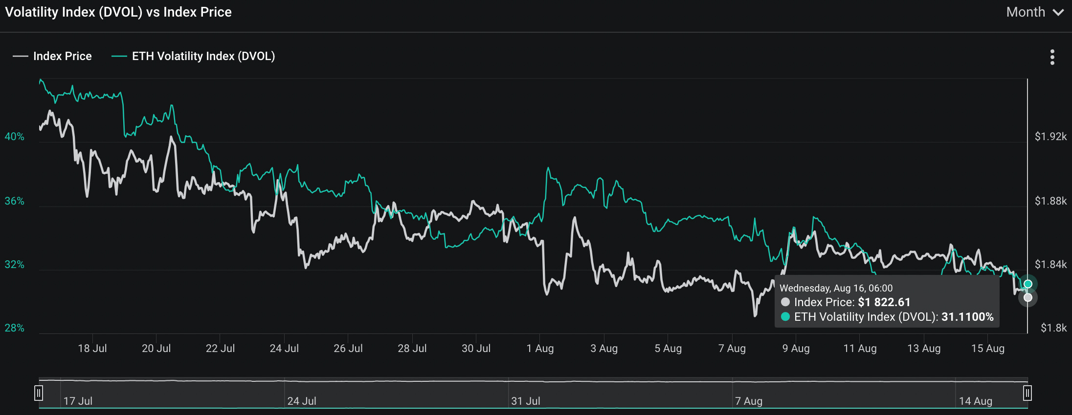 而作為加密市場第二大的幣種以太坊,根據 Deribit 的數據顯示,也來到了 31% 的歷史新低。