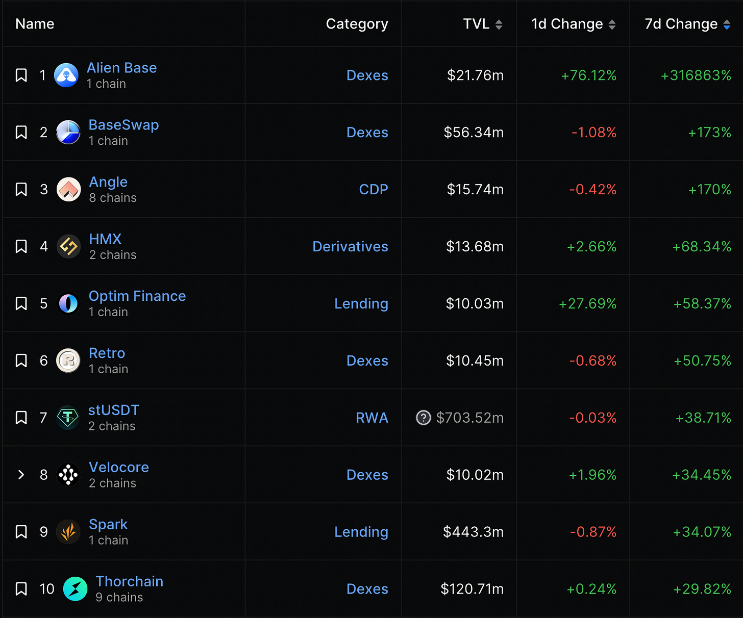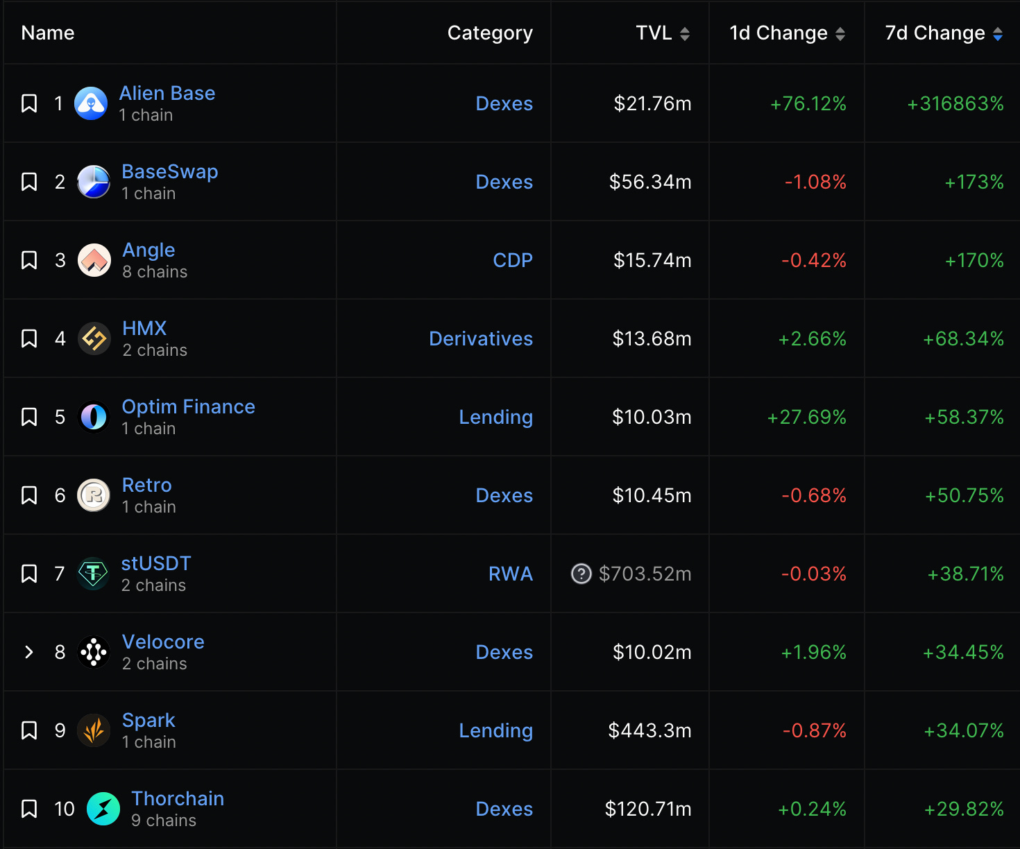 這週 TVL 成長最高之協議(最低1000萬美金TVL)第一、二名皆為 Base 上的 Dex (AlienBase、Baseswap)提供高額年化報酬作為獎勵,吸引用戶存入資金。