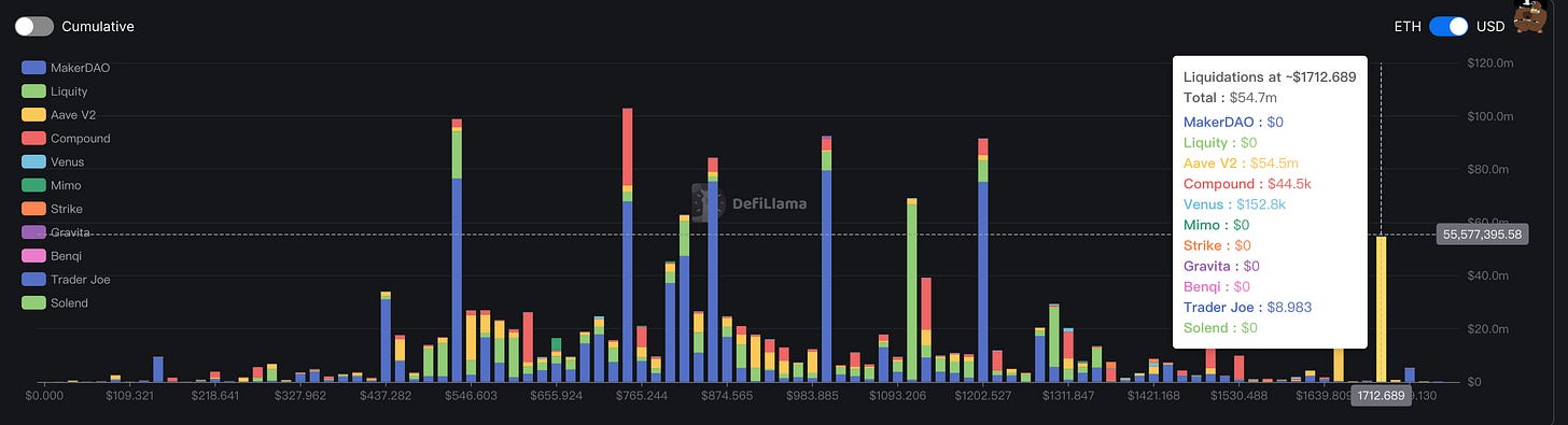 最近的清算點位為 1712,規模約為 5500 萬美元,其中以 Aave 上債務佔大多數,與上週規模相同。