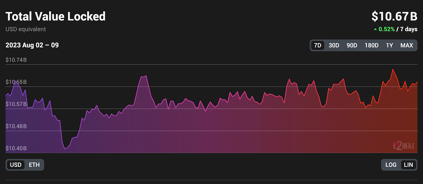 Base 一支獨秀,從 L2beat 數據來看也呈現大幅增長態勢,成長將近 70%
