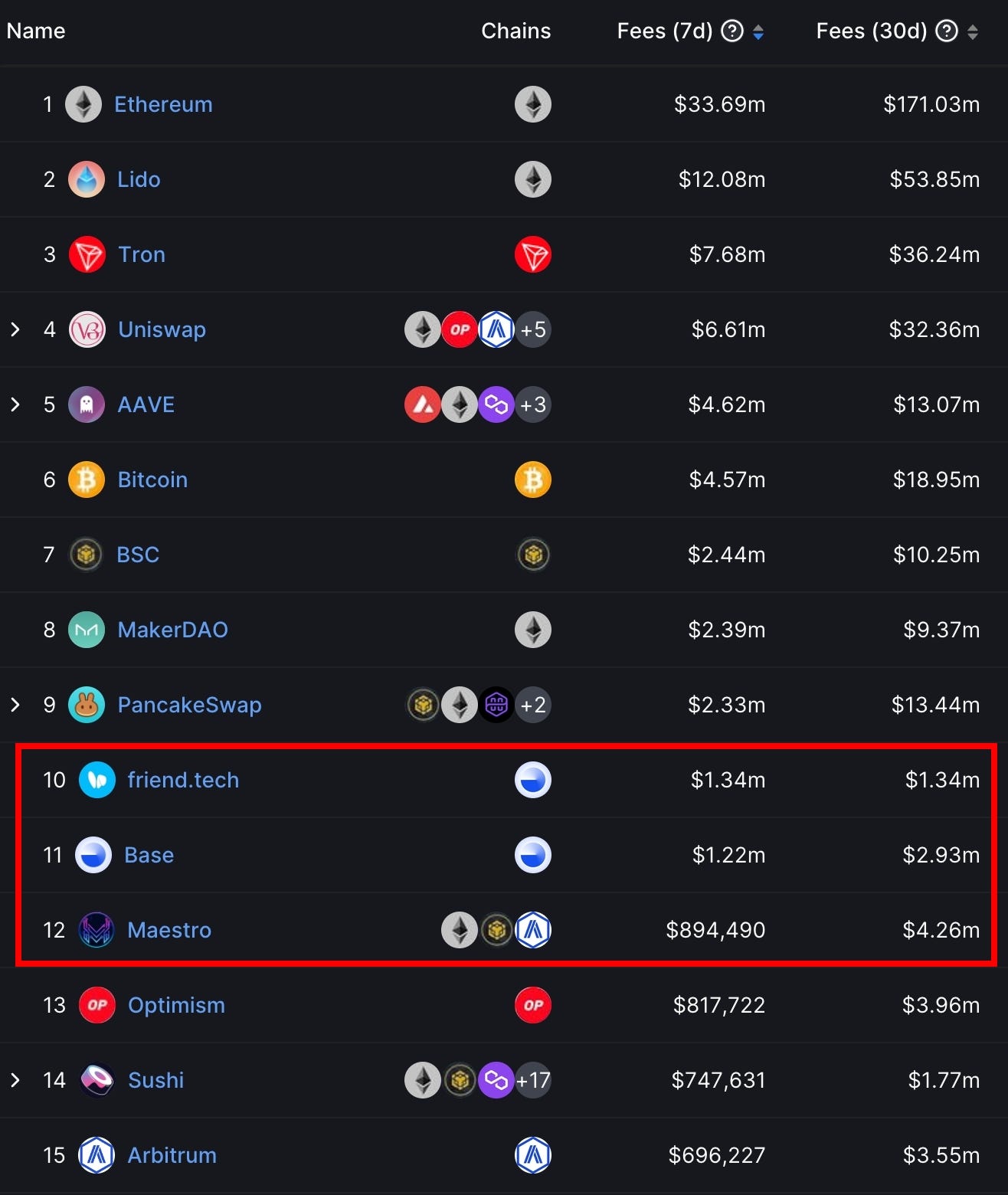 但最令人驚喜的莫過於 Telegram 的機器人 Maestro,近七天收益仍排在第 12 名,力壓眾多公鏈以及老牌協議。