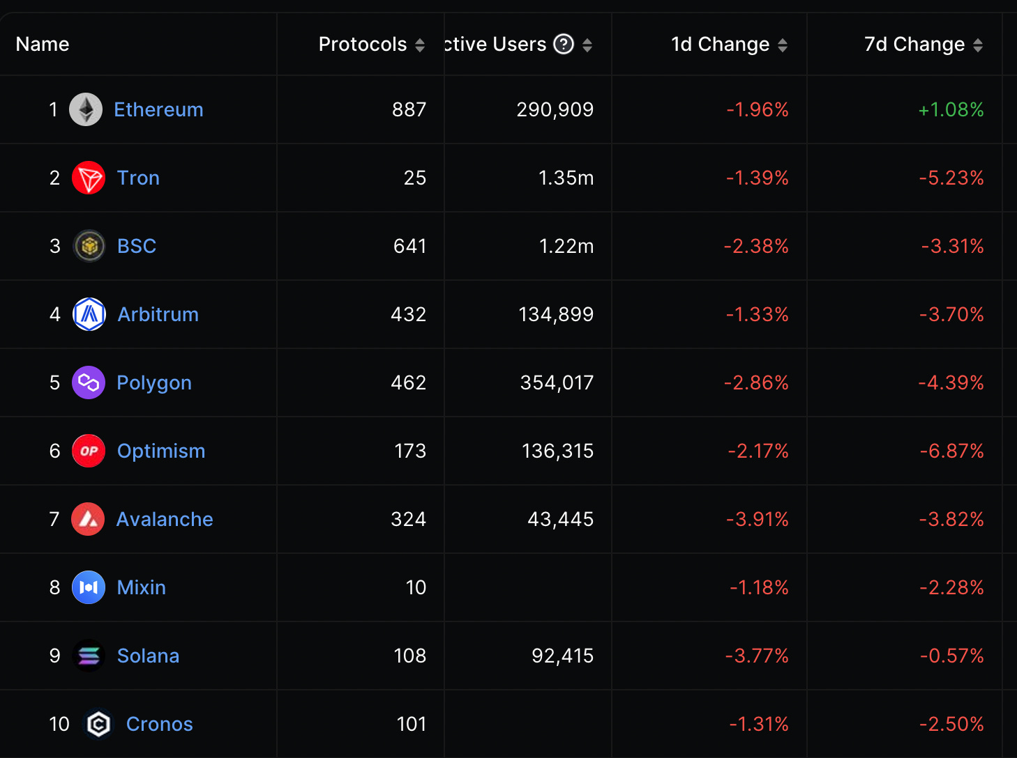 前10大公鏈/ Layer 2 總鎖倉量變化: