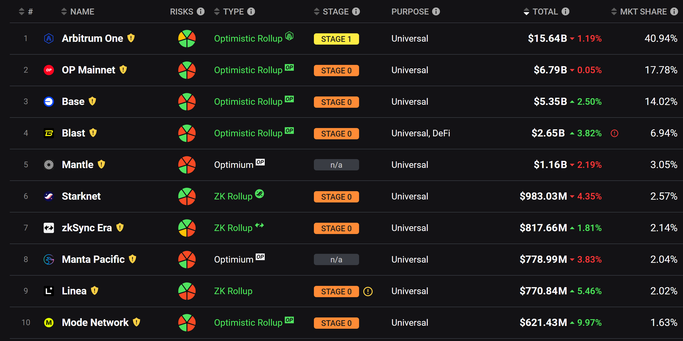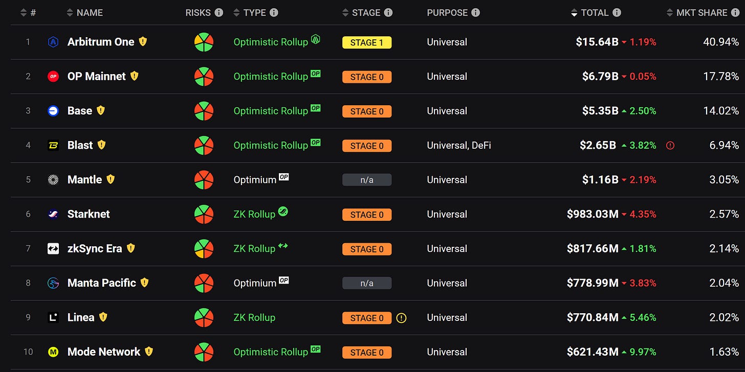 Rollups 前十名中,Linea 和 Mode 生態內部的 DeFi 發展遠不如 zkSync、Starknet等,TVL 占比中超過一半均為 LRT 或 LRTFi 質押,除了質押之外少有其他項目可以帶來活躍度。