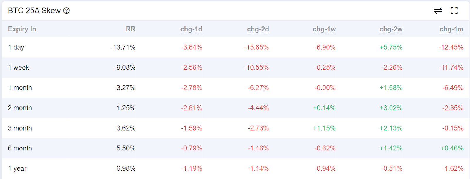 過去一週在底部反彈的時候1個月內到期的 RR 均大於零;至今日行情逐漸轉弱之後 RR則迅速轉負,短期內表現較不樂觀。