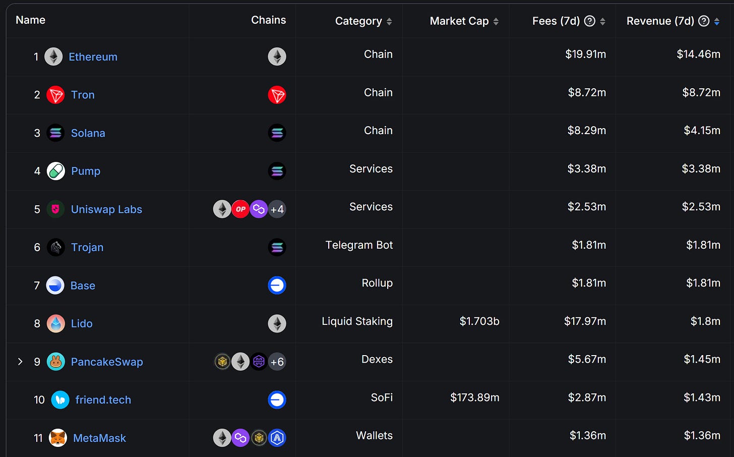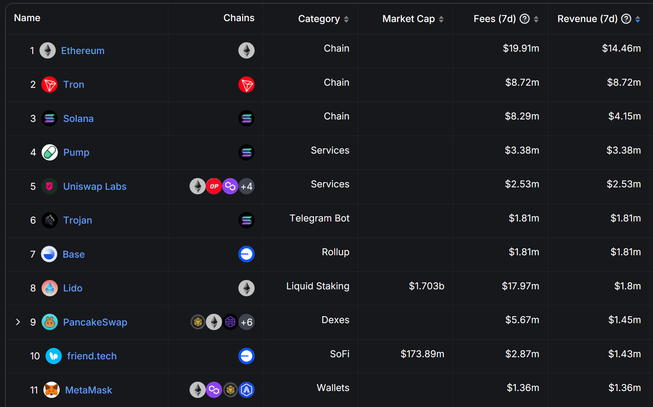 7日真實收益(Fees)排行