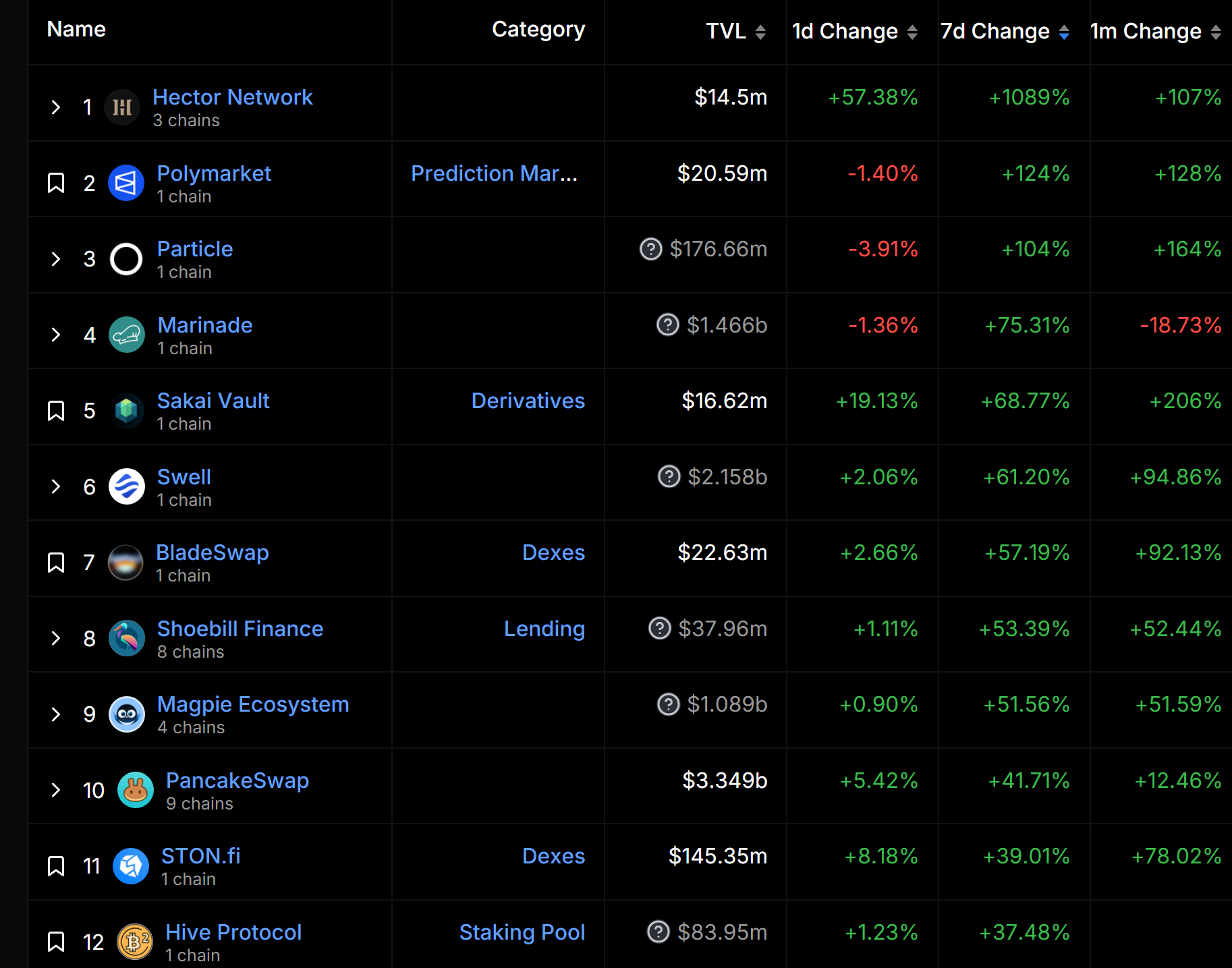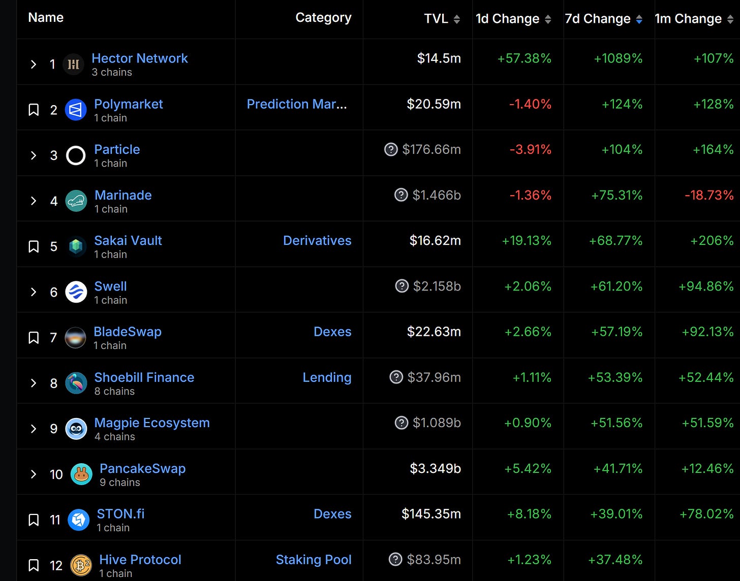 漲幅最大項目(TVL 大於 10M)