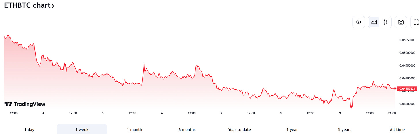 ETH / BTC 過去一週緩降至 0.048-0.049 的區間,主因為 ETH 在本周反彈力道較弱,BTC 從底部反彈約 6%;ETH 則不到 1%,全球首個 ETH ETF 於香港上市後,目前來看沒有帶來足夠大的影響。