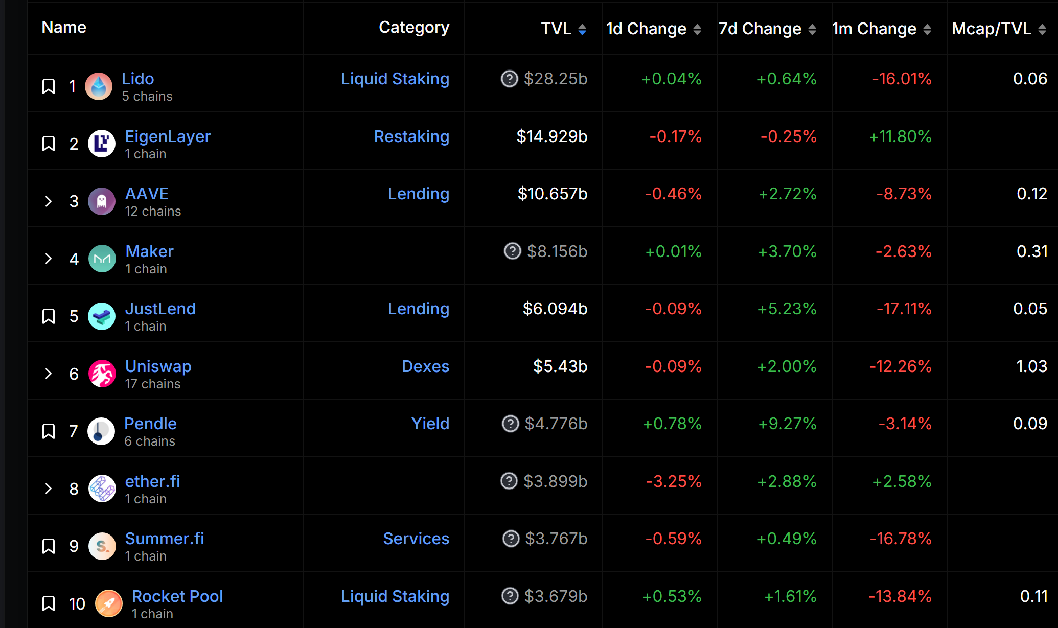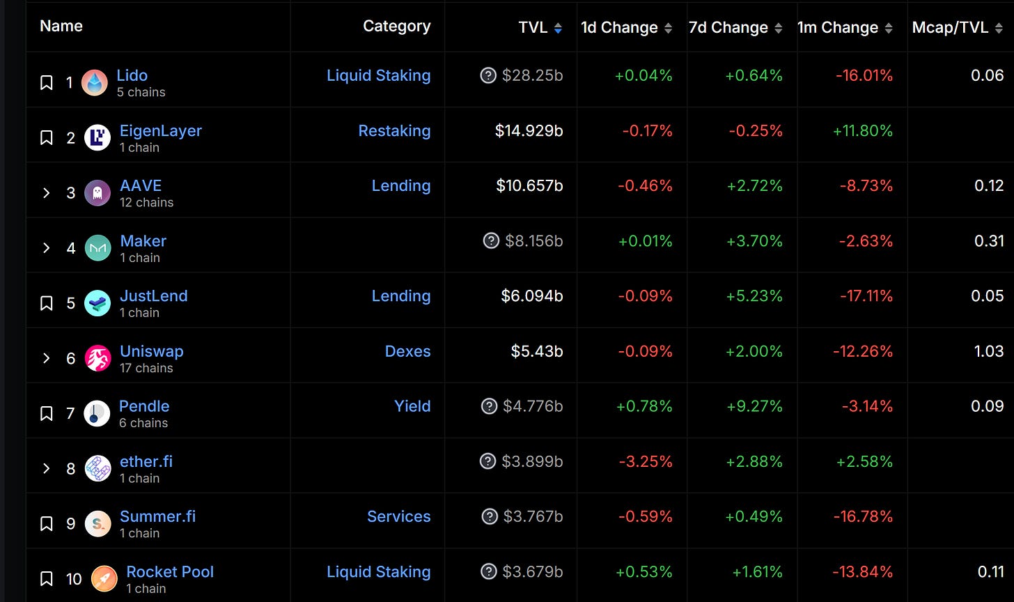 前十大項目長期以來多為 DeFi 基礎設施、再質押(restaking)、流動性質押(LST)、流動性再質押(LRT)項目。
